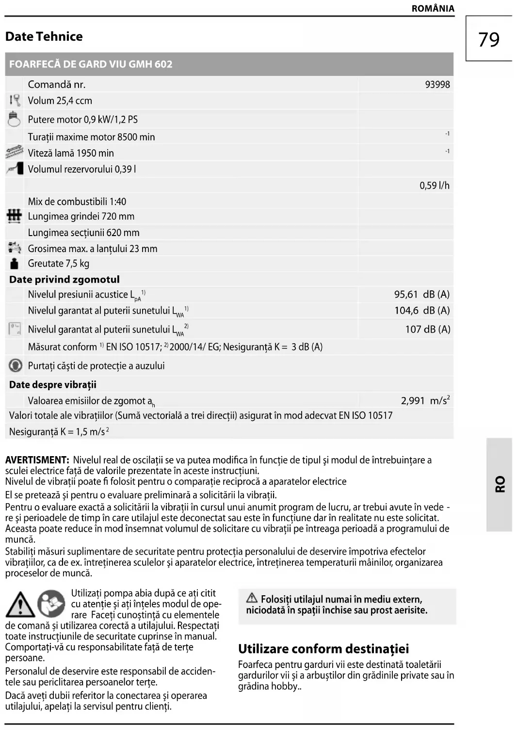 tele sau periclitarea persoanelor terţe. Dacă aveţi dubii referitor la conectarea şi operarea utilajului, apelaţi la servisul pentru clienţi. Folosiţi utilajul numai în mediu extern, niciodată în spaţii închise sau prost aerisite. Utilizare conform destinaţiei Foarfeca pentru garduri vii este destinată toaletării gardurilor vii și a arbuștilor din grădinile private sau în grădina hobby..80