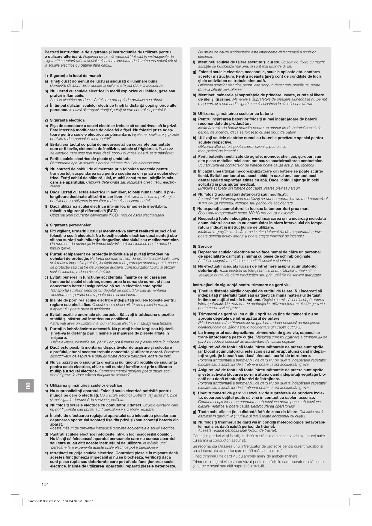 a) Repararea sculelor electrice se va face numai de către un personal de specialitate calificat şi numai cu piese de schimb originale. Astfel se asigură menţinerea securităţii sculelor electrice. b) Nu efectuai niciodată lucrări de întreinere asupra acumulatorilor deteriorai. Toate lucrările de întreinere ale acumulatorilor trebuie să se realizeze numai de către producător sau prin unităile de service autorizate. Instrucţiuni de siguranţă pentru trimmere de gard viu a) Ţineţi la distanţă părţile corpului de cuţitul de tăiere. Nu încercaţi să îndepărtaţi materialul tăiat sau să ţineţi cu mâna materialul de tăiat în timp ce cuţitul este în funcţiune. Cuţitele se mișcă inerţial după oprirea întrerupătorului. Un moment de neatenţie la utilizarea trimmerului de gard viu poate cauza leziuni grave. b) Trimmerul de gard viu cu cuţitul oprit se va ţine de mâner și nu se apropie degetele de întrerupătorul de putere. Prinderea corectă a trimmerului de gard viu reduce pericolul de funcţionare neintenţionată cauzând astfel o accidentare din cauza cuţitului. c) La transportul sau depozitarea trimmerului de gard viu, capacul se trage întotdeauna peste cuţite. Mânuirea corespunzătoare a trimmerului de gard viu reduce pericolul de accidentare din cauza cuţitului. d) Asiguraţi-vă de faptul că toate întrerupătoarele de putere sunt oprite, iar blocul acumulatorului este scos sau întrerupt atunci când îndepăr- taţi vegetaţie blocată sau dacă efectuaţi lucrări de întreţinere. Pornirea accidentală a trimmerului de gard viu pe durata îndepărtării vegetaţiei blocate sau a lucrărilor de întreţinere poate cauza accidentări grave. e) Asiguraţi-vă de faptul că toate întrerupătoarele de putere sunt oprite și este activată blocarea pornirii atunci când îndepărtaţi vegetaţie blo- cată sau dacă efectuaţi lucrări de întreţinere. Pornirea accidentală a trimmerului de gard viu pe durata îndepărtării vegetaţiei blocate sau a lucrărilor de întreţinere poate cauza accidentări grave. f) Ţineţi trimmerul de gard viu exclusiv de suprafeţele de prindere izola- te, deoarece cuţitul poate să vină în contact cu cabluri ascunse. Contactul cuţitelor cu un conductor sub tensiune poate pune sub tensiune piesele metalice şi poate cauza electrocutarea operatorului. g) Toate cablurile se ţin la distanţă faţă de zona de tăiere. Cablurile pot fi ascunse în garduri vii şi tufişuri şi pot fi tăiate accidental cu cuţitul. h) Nu folosiţi trimmerul de gard viu în condiţii meteorologice nefavorabi- le, mai ales dacă există pericol de trăsnet. Aceasta reduce pericolul unei lovituri de trăsnet. Căutaţi în garduri vii şi în tufişuri dacă există obiecte ascunse (de ex. împrejmuire cu sârmă şi conductori ascunşi). Se recomandă utilizarea unui întrerupător de protecţie pentru curenţi vagabonzi cu o intensitate de declanşare de 30mA sau mai mică. Ţineţi trimmerul de gard viu cu ambele mâini de ambele mânere. Trimmerul de gard viu este prevăzut pentru lucrările în care operatorul stă pe sol şi nu pe o scară sau altă suprafaţă instabilă. 14730-20.960.01.indd 104 04.09.20 09:37RO