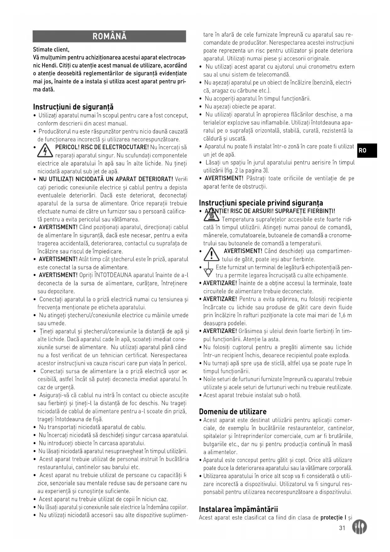 nic Hendi. Citiţi cu atenţie acest manual de utilizare, acordând o atenţie deosebită reglementărilor de siguranţă evidenţiate mai jos, înainte de a instala şi utiliza acest aparat pentru pri