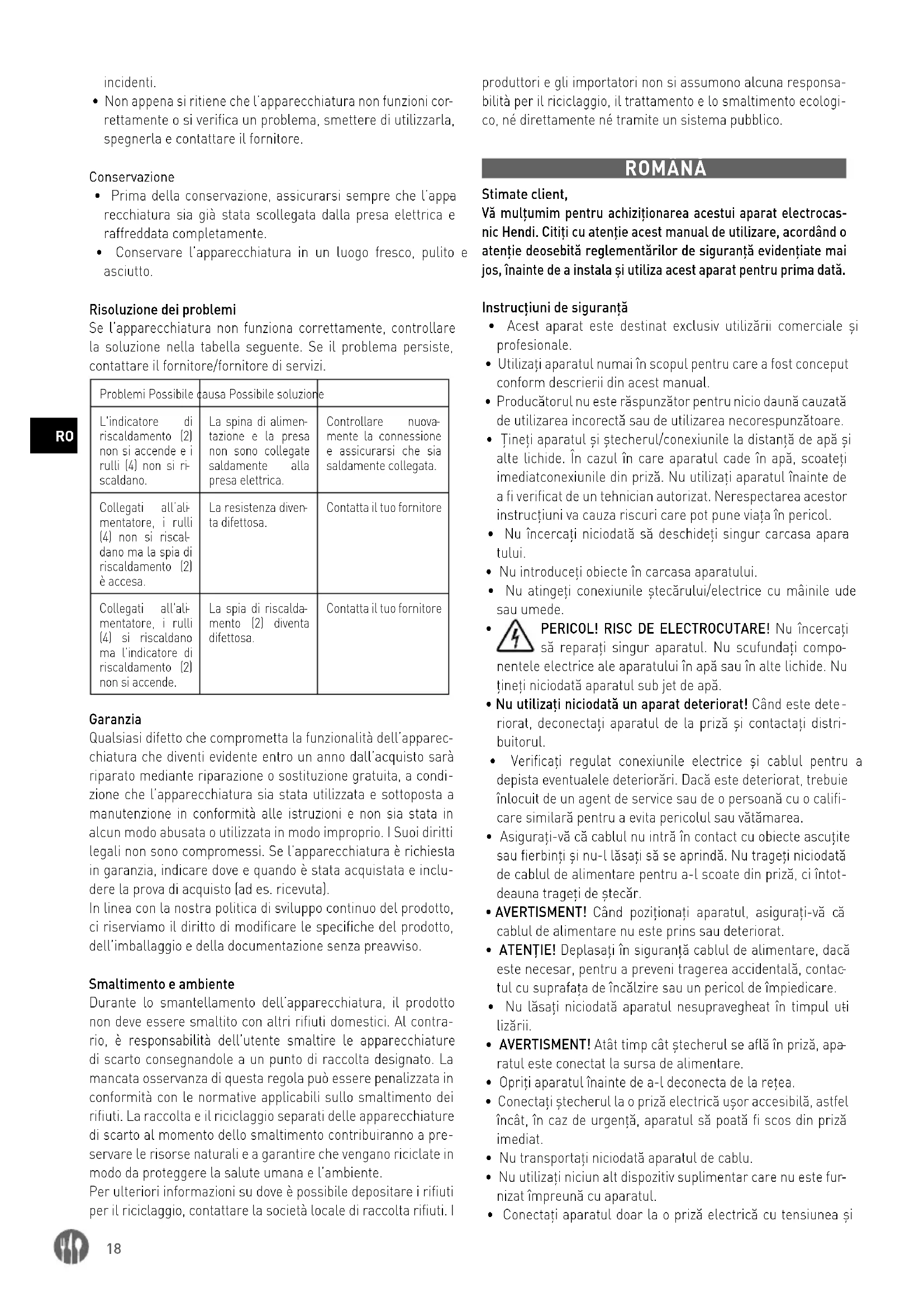 - Aparatul este echipat cu un „Termostat de protecţie”. În caz de supraîncălzire a rolelor, protecția va fi activată și oprește aparatul. Reduceți aparatul de la priza electrică și așteptați răcirea. Apoi, acesta poate fi utilizat din nou.