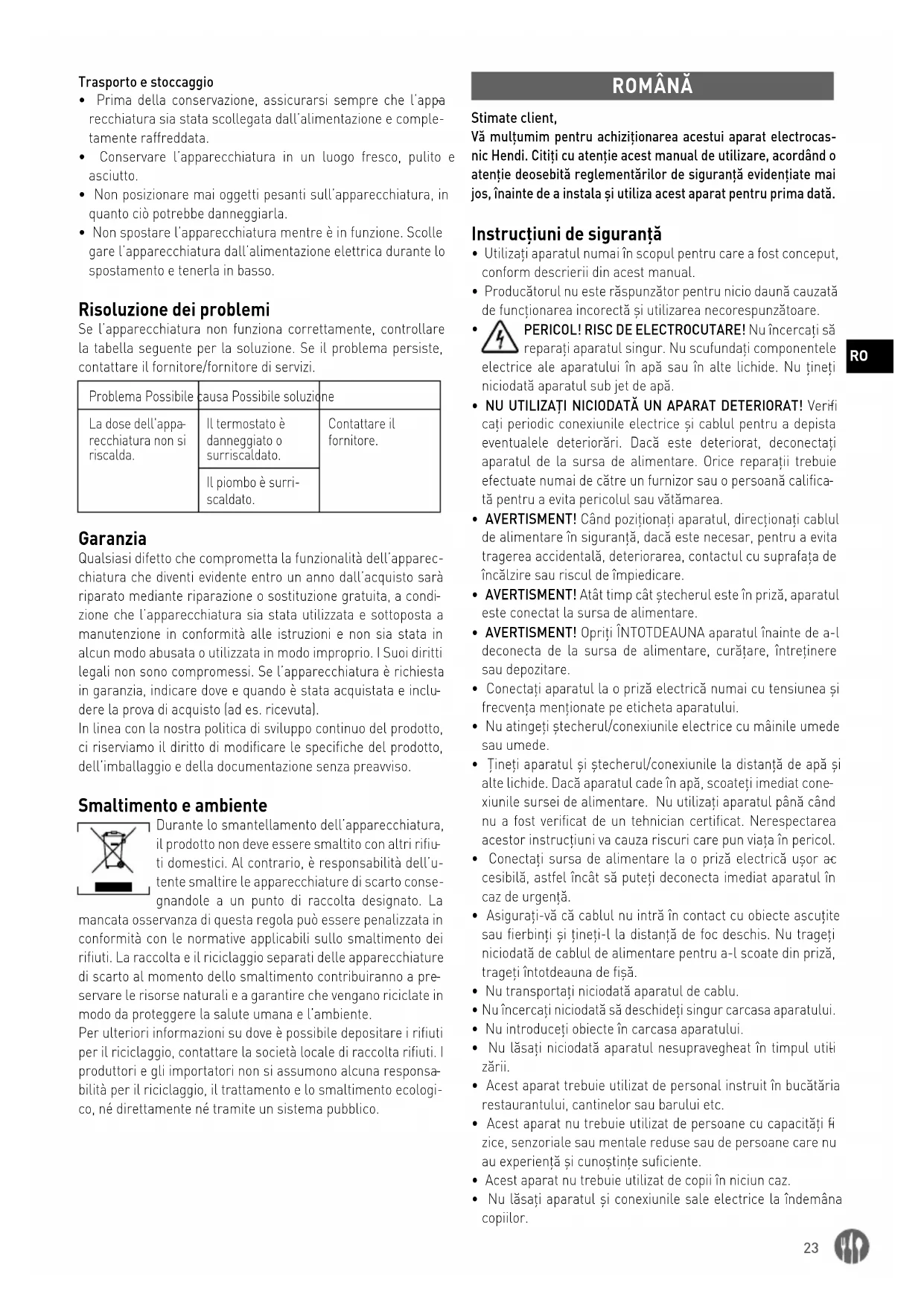 bilità per il riciclaggio, il trattamento e lo smaltimento ecologi- co, né direttamente né tramite un sistema pubblico. ROMÂNĂ Stimate client, Vă mulţumim pentru achiziţionarea acestui aparat electrocas- nic Hendi. Citiţi cu atenţie acest manual de utilizare, acordând o atenţie deosebită reglementărilor de siguranţă evidenţiate mai jos, înainte de a instala şi utiliza acest aparat pentru prima dată. Instrucțiuni de siguranță