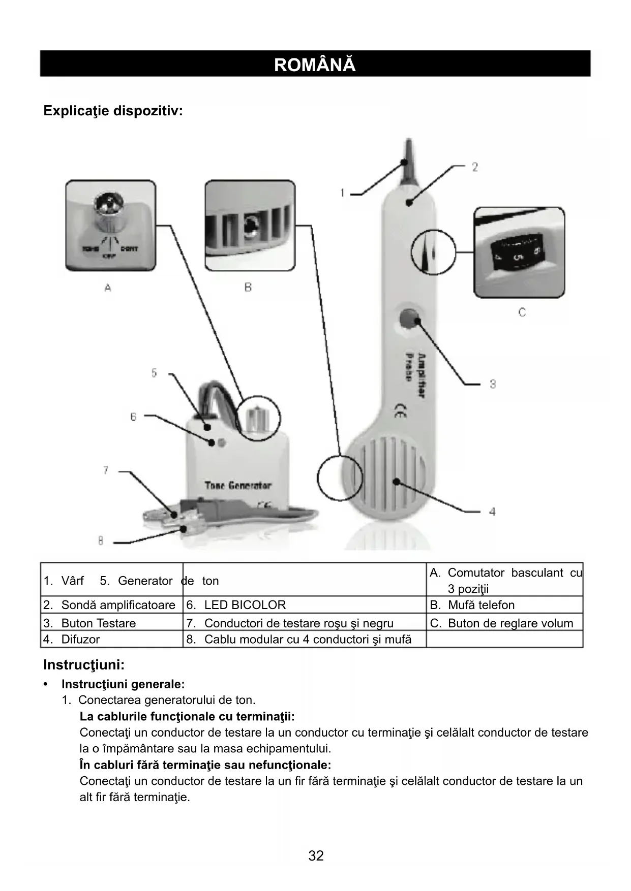 3. Buton Testare 7. Conductori de testare roşu şi negru C. Buton de reglare volum