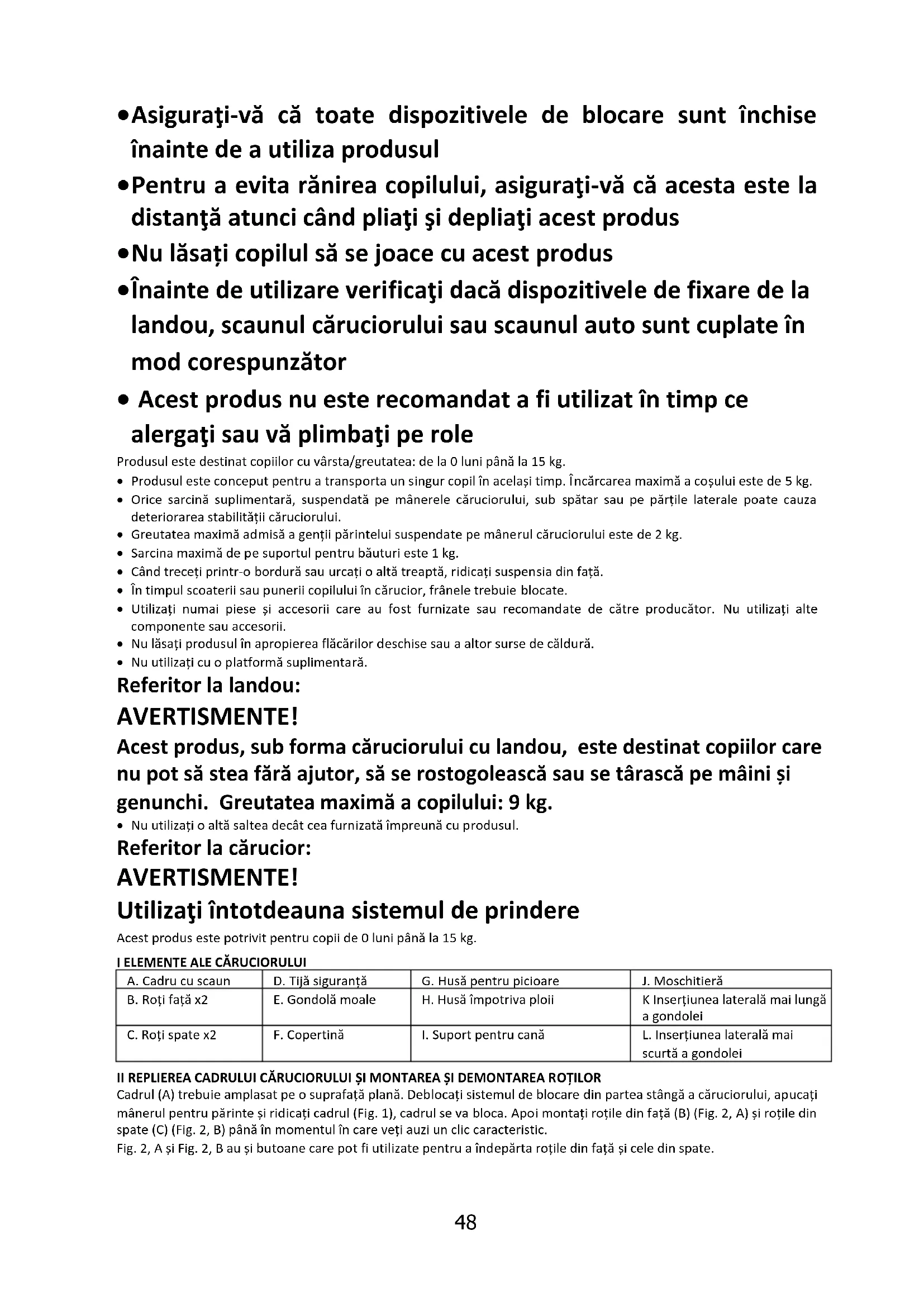 - Nu utilizați cu o platformă suplimentară. Referitor la landou: AVERTISMENTE! Acest produs, sub forma căruciorului cu landou, este destinat copiilor care nu pot să stea fără ajutor, să se rostogolească sau se târască pe mâini și genunchi. Greutatea maximă a copilului: 9 kg.