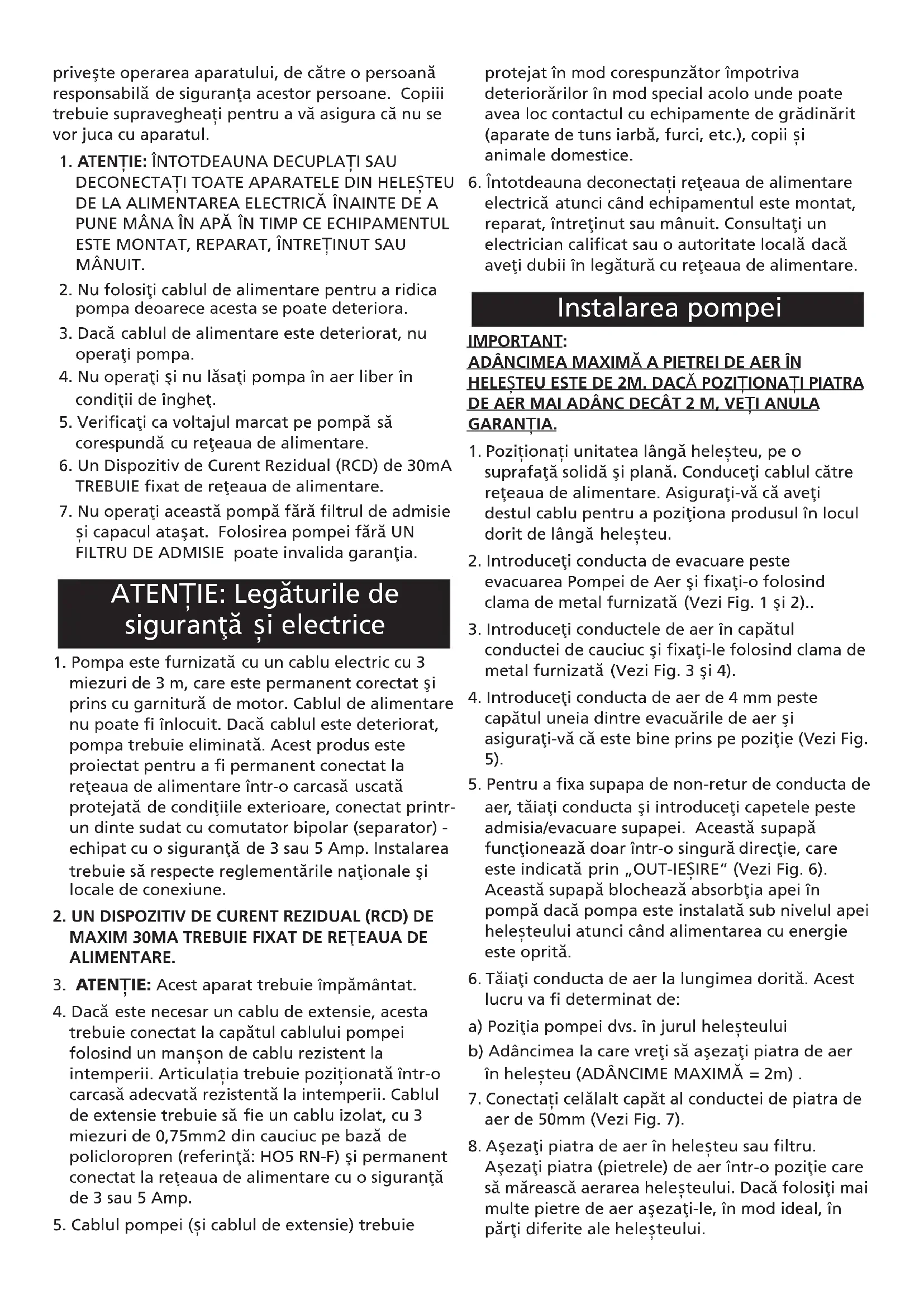 electric8 atunci când echipamentul este montat, reparat, întreVinut sau mânuit. ConsultaVi un electrician calificat sau o autoritate local8 dac8 aveVi dubii în leg8tur8 cu reVeaua de alimentare. IMPORTANT: ADÂNCIMEA MAXIM7 A PIETREI DE AER ÎN HELEdTEU ESTE DE 2M. DAC7 POZIfIONAfI PIATRA DE AER MAI ADÂNC DECÂT 2 M, VEfI ANULA GARANfIA.