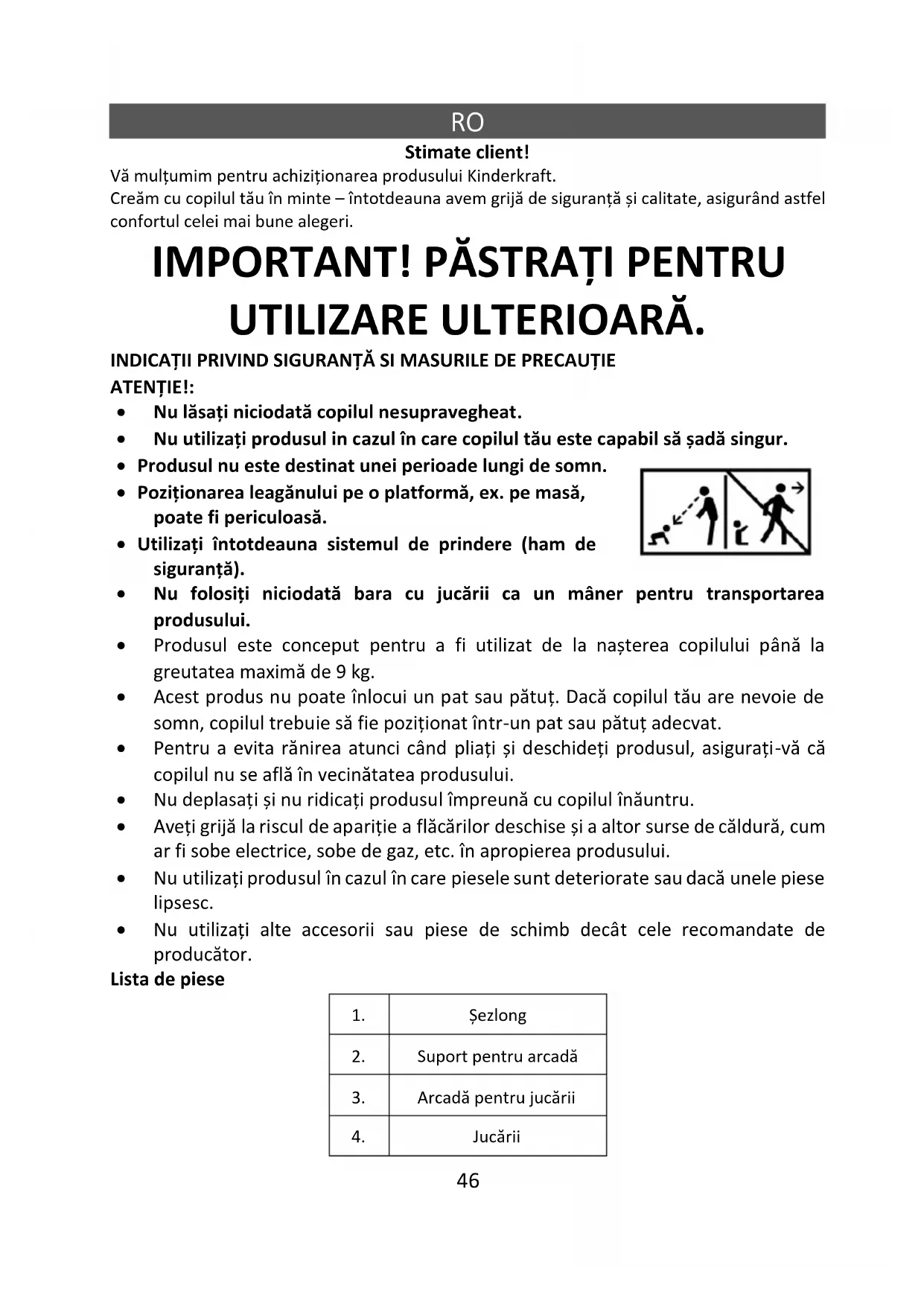 Stimate client! Vă mulțumim pentru achiziționarea produsului Kinderkraft. Creăm cu copilul tău în minte – întotdeauna avem grijă de siguranță și calitate, asigurând astfel confortul celei mai bune alegeri.