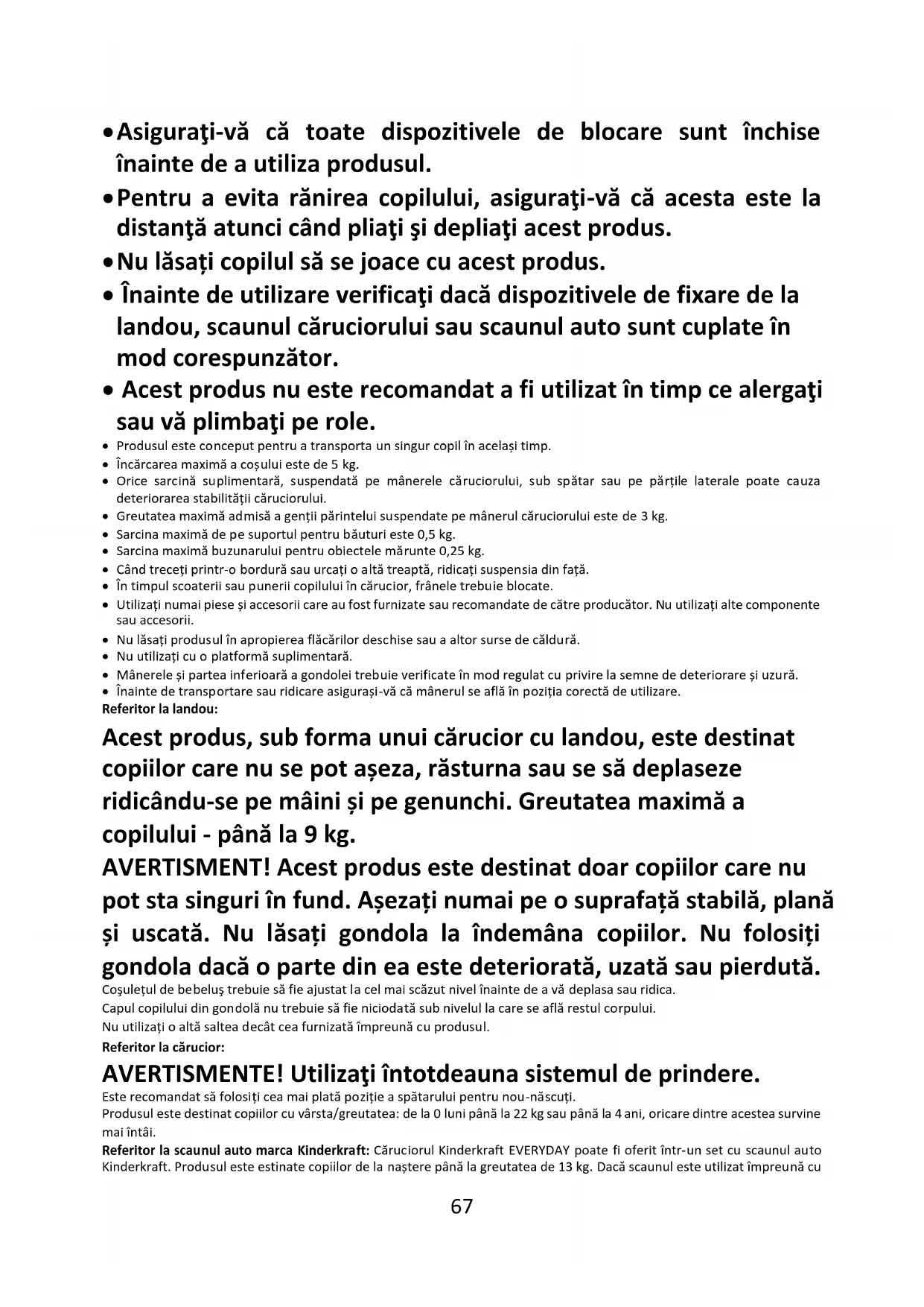 - Înainte de transportare sau ridicare asigurași-vă că mânerul se află în poziția corectă de utilizare. Referitor la landou: Acest produs, sub forma unui cărucior cu landou, este destinat copiilor care nu se pot așeza, răsturna sau se să deplaseze ridicându-se pe mâini și pe genunchi. Greutatea maximă a copilului - până la 9 kg. AVERTISMENT! Acest produs este destinat doar copiilor care nu pot sta singuri în fund. Așezați numai pe o suprafață stabilă, plană și uscată. Nu lăsați gondola la îndemâna copiilor. Nu folosiți gondola dacă o parte din ea este deteriorată, uzată sau pierdută. Coşulețul de bebeluş trebuie să fie ajustat la cel mai scăzut nivel înainte de a vă deplasa sau ridica. Capul copilului din gondolă nu trebuie să fie niciodată sub nivelul la care se află restul corpului. Nu utilizați o altă saltea decât cea furnizată împreună cu produsul. Referitor la cărucior: AVERTISMENTE! Utilizaţi întotdeauna sistemul de prindere. Este recomandat să folosiți cea mai plată poziție a spătarului pentru nou-născuți. Produsul este destinat copiilor cu vârsta/greutatea: de la 0 luni până la 22 kg sau până la 4 ani, oricare dintre acestea survine mai întâi. Referitor la scaunul auto marca Kinderkraft: Căruciorul Kinderkraft EVERYDAY poate fi oferit într-un set cu scaunul auto Kinderkraft. Produsul este estinate copiilor de la naștere până la greutatea de 13 kg. Dacă scaunul este utilizat împreună cu68 un cărucior, acesta nu înlocuiește leagănul sau pătuțul. Dacă copilul dvs. Are nevoie de somn, acesta ar trebui mutat într-un landou, leagăn sau pătuț. Utilizați numai piese și accesorii care au fost furnizate sau recomandate de către producător. I Elementele căruciorului