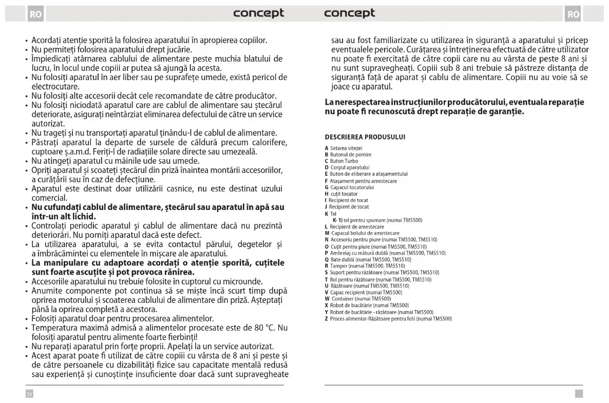 - Acest aparat poate fi utilizat de către copiii cu vârsta de 8 ani și peste și de către persoanele cu dizabilități fizice sau capacitate mentală redusă sau experiență și cunoștințe insuficiente doar dacă sunt supravegheate sau au fost familiarizate cu utilizarea în siguranță a aparatului și pricep eventualele pericole. Curățarea și întreținerea efectuată de către utilizator nu poate fi exercitată de către copii care nu au vârsta de peste 8 ani și nu sunt supravegheați. Copiii sub 8 ani trebuie să păstreze distanța de siguranță față de aparat și cablu de alimentare. Copiii nu au voie să se joace cu aparatul. La nerespectarea instrucțiunilor producătorului, eventuala reparație nu poate fi recunoscută drept reparație de garanție. DESCRIEREA PRODUSULUI A Setarea vitezei B Butonul de pornire C Buton Turbo D Corpul aparatului E Buton de eliberare a atașamentului F Atașament pentru amestecare G Capacul tocatorului H cuțit tocator I Recipient de tocat J Recipient de tocat K Tel K- 1) tel pentru spumare (numai TM5500) L Recipient de amestecare M Capacul bolului de amestecare N Accesoriu pentru piure (numai TM5500, TM5510) O Cuțit pentru piure (numai TM5500, TM5510) P Ambreiaj cu mătură dublă (numai TM5500, TM5510) Q Bate dublă (numai TM5500, TM5510) R Tamper (numai TM5500, TM5510) S Suport pentru răzătoare (numai TM5500, TM5510) T Bol pentru răzătoare (numai TM5500, TM5510) U Răzătoare (numai TM5500, TM5510) V Capac recipient (numai TM5500) W Container (numai TM5500) X Robot de bucătărie (numai TM5500) Y Robot de bucătărie - răzătoare (numai TM5500) Z Proces alimentar-Răzătoare pentru felii (numai TM5500)76 77 RORO