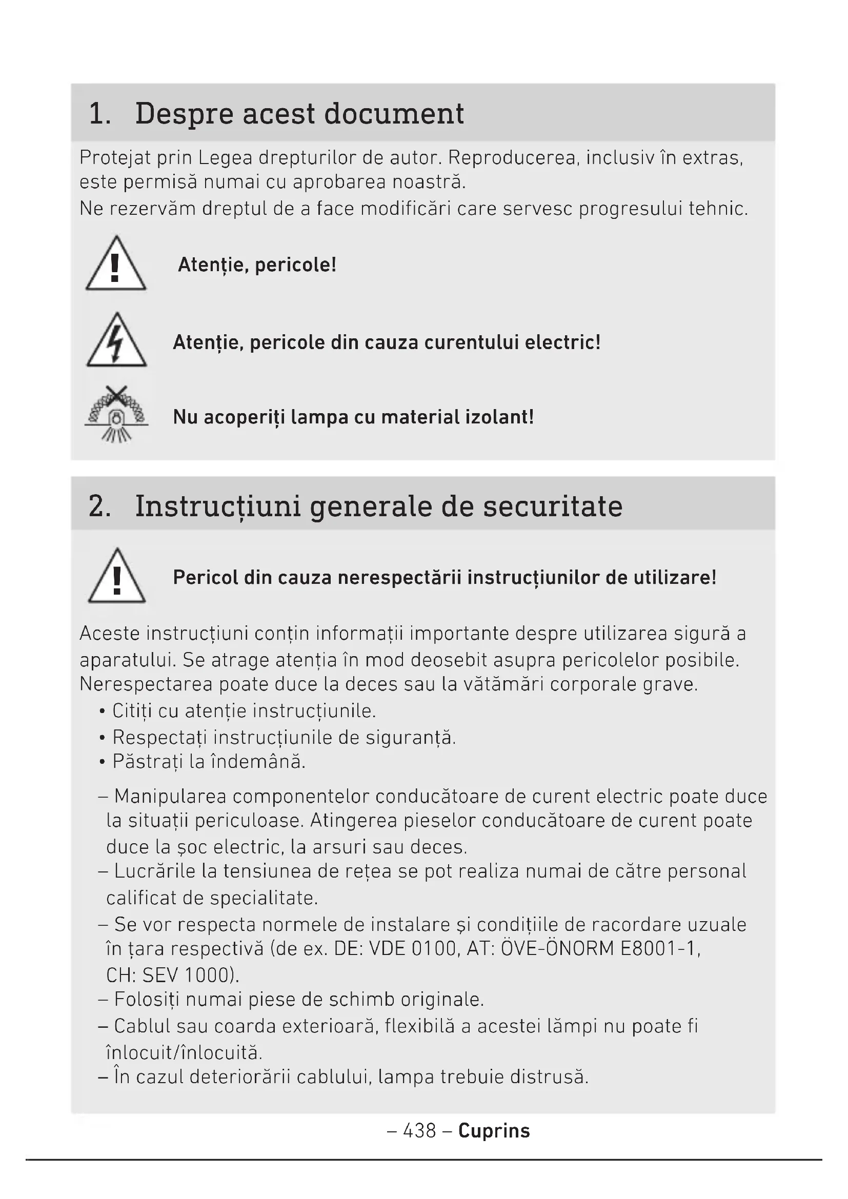 - Păstraţi la îndemână. – Manipularea componentelor conducătoare de curent electric poate duce la situaţii periculoase. Atingerea pieselor conducătoare de curent poate duce la şoc electric, la arsuri sau deces. – Lucrările la tensiunea de reţea se pot realiza numai de către personal calificat de specialitate. – Se vor respecta normele de instalare şi condiţiile de racordare uzuale în ţara respectivă (de ex. DE: VDE0100, AT:ÖVE-ÖNORM E8001-1, CH:SEV1000). – Folosiţi numai piese de schimb originale. – Cablul sau coarda exterioară, flexibilă a acestei lămpi nu poate fi înlocuit/înlocuită. – În cazul deteriorării cablului, lampa trebuie distrusă.– 439 – Cuprins