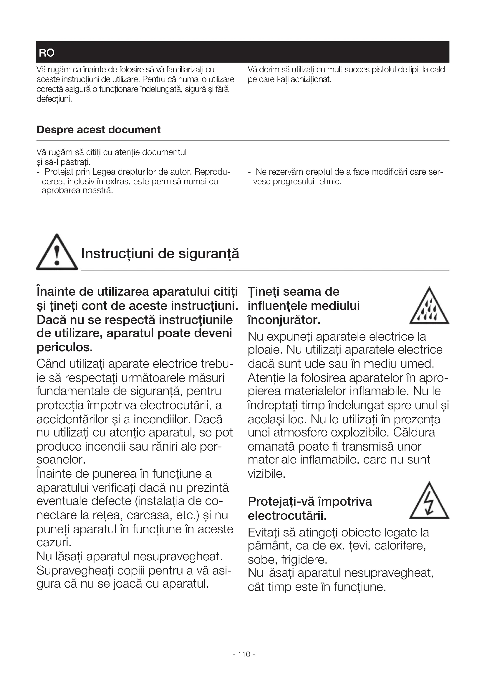 HERSTELLER GARANTIE HERSTELLER GARANTIE Obowiązywanie polskiego prawaObowiązuje polskie prawo z wyłączeniem Konwencji Narodów Zjednoczonych o międzynarodowej sprze-daży towarów (CISG).Dochodzenie roszczeńJeżeli chcą Państwo skorzystać z gwarancji, pro-simy o przesłanie produktu w stanie kompletnym, wraz z oryginalnym dowodem zakupu, który musi zawierać datę zakupu i oznaczenie produktu, do swojego sprzedawcy lub bezpośrednio do nas: „LŁ” Spółka z ograniczoną odpowiedzialnością sp. k. dawniej „Lange Łukaszuk” spółka jawnaByków, ul. Wrocławska 43, 55-095 Mirków, Poland. Z tego powodu zalecamy staranne przechowywanie dowodu zakupu aż do momentu upływu okresu gwarancyjnego. PL- 110 - Vă rugăm ca înainte de folosire să vă familiarizaţi cu aceste instrucţiuni de utilizare. Pentru că numai o utilizare corectă asigură o funcţionare îndelungată, sigură şi fără defecţiuni. Vă dorim să utilizaţi cu mult succes pistolul de lipit la cald pe care l-aţi achiziţionat. ROInstrucţiuni de utilizare originale Despre acest document Vă rugăm să citiţi cu atenţie documentul şi să-l păstraţi. - Protejat prin Legea drepturilor de autor. Reprodu- cerea, inclusiv în extras, este permisă numai cu aprobarea noastră. - Ne rezervăm dreptul de a face modificări care ser- vesc progresului tehnic. Înainte de utilizarea aparatului citiţi şi ţineţi cont de aceste instrucţiuni. Dacă nu se respectă instrucţiunile de utilizare, aparatul poate deveni periculos. Când utilizaţi aparate electrice trebu- ie să respectaţi următoarele măsuri fundamentale de siguranţă, pentru protecţia împotriva electrocutării, a accidentărilor şi a incendiilor. Dacă nu utilizaţi cu atenţie aparatul, se pot produce incendii sau răniri ale per- soanelor. Înainte de punerea în funcţiune a aparatului verificaţi dacă nu prezintă eventuale defecte (instalaţia de co- nectare la reţea, carcasa, etc.) şi nu puneţi aparatul în funcţiune în aceste cazuri. Nu lăsaţi aparatul nesupravegheat. Supravegheaţi copiii pentru a vă asi- gura că nu se joacă cu aparatul. Ţineţi seama de influenţele mediului înconjurător. Nu expuneţi aparatele electrice la ploaie. Nu utilizaţi aparatele electrice dacă sunt ude sau în mediu umed. Atenţie la folosirea aparatelor în apro- pierea materialelor inflamabile. Nu le îndreptaţi timp îndelungat spre unul şi acelaşi loc. Nu le utilizaţi în prezenţa unei atmosfere explozibile. Căldura emanată poate fi transmisă unor materiale inflamabile, care nu sunt vizibile. Protejaţi-vă împotriva electrocutării. Evitaţi să atingeţi obiecte legate la pământ, ca de ex. ţevi, calorifere, sobe, frigidere. Nu lăsaţi aparatul nesupravegheat, cât timp este în funcţiune. Instrucţiuni de siguranţă RO- 110 - - 111 - Păstraţi aparatele în siguranţă. După folosire, aşezaţi aparatul pe su- port şi lăsaţi-l să se răcească, înainte de a-l strânge. Aparatele care nu se folosesc trebuie păstrate în locuri uscate, încuiate şi neaccesibile copiilor. Acest aparat poate fi utilizat de co- pii începând cu vârsta de 8 ani şi de persoane cu capacităţi psihice, senzoriale sau mentale limitate ori cu experienţă şi pricepere redusă, cu condiţia să fie supravegheaţi/ supravegheate sau să fi fost instruiţi/ instruite cu privire la utilizarea sigură a aparatului şi să înţeleagă pericolele legate de folosirea acestuia. Copiilor le este interzis să se joace cu aparatul. Curăţarea şi lucrările de întreţinere care sunt responsabilitatea utilizato- rului nu se vor executa de către copii nesupravegheaţi. Nu suprasolicitaţi aparatele. Acestea funcţionează mai bine şi mai sigur în intervalul de putere indicat. Nu transportaţi aparatul ţinând-l de cablu şi nu utilizaţi cablul pentru a scoate ştecherul din priză. Protejaţi cablul de căldură, ulei şi muchii ascuţite. Aveţi grijă la gazele toxice şi la pericolul de aprindere. La prelucrarea materialelor sintetice, a lacurilor şi a altor materiale similare pot apărea gaze toxice. Ţineţi seama de pericolul de incendiu şi aprindere. Pentru propria siguranţă utilizaţi nu- mai accesorii şi aparate suplimentare care sunt indicate în instrucţiunile de utilizare sau sunt recomandate ori in- dicate de producătorul aparatului. Utilizarea altor aparate suplimentare sau accesorii decât a celor recoman- date în instrucţiunile de utilizare ori în catalog poate semnifica un pericol de rănire pentru dumneavoastră. Reparaţiile se vor face numai de către un specialist electrician. Acest aparat electric respectă pre- vederile de siguranţă aplicabile. Reparaţiile nu pot fi făcute decât de către un electrician specialist, în caz contrar pot surveni accidentări ale utilizatorului. Când se deteriorează cablul de alimentare la reţea, acesta va fi înlocuit de producător, de servi- ciul său pentru clienţi sau de către o persoană similar calificată, pentru a evita accidentele. Păstraţi bine aceste instrucţiuni de siguranţă alături de aparat. Instrucţiuni de siguranţă RO- 112 -