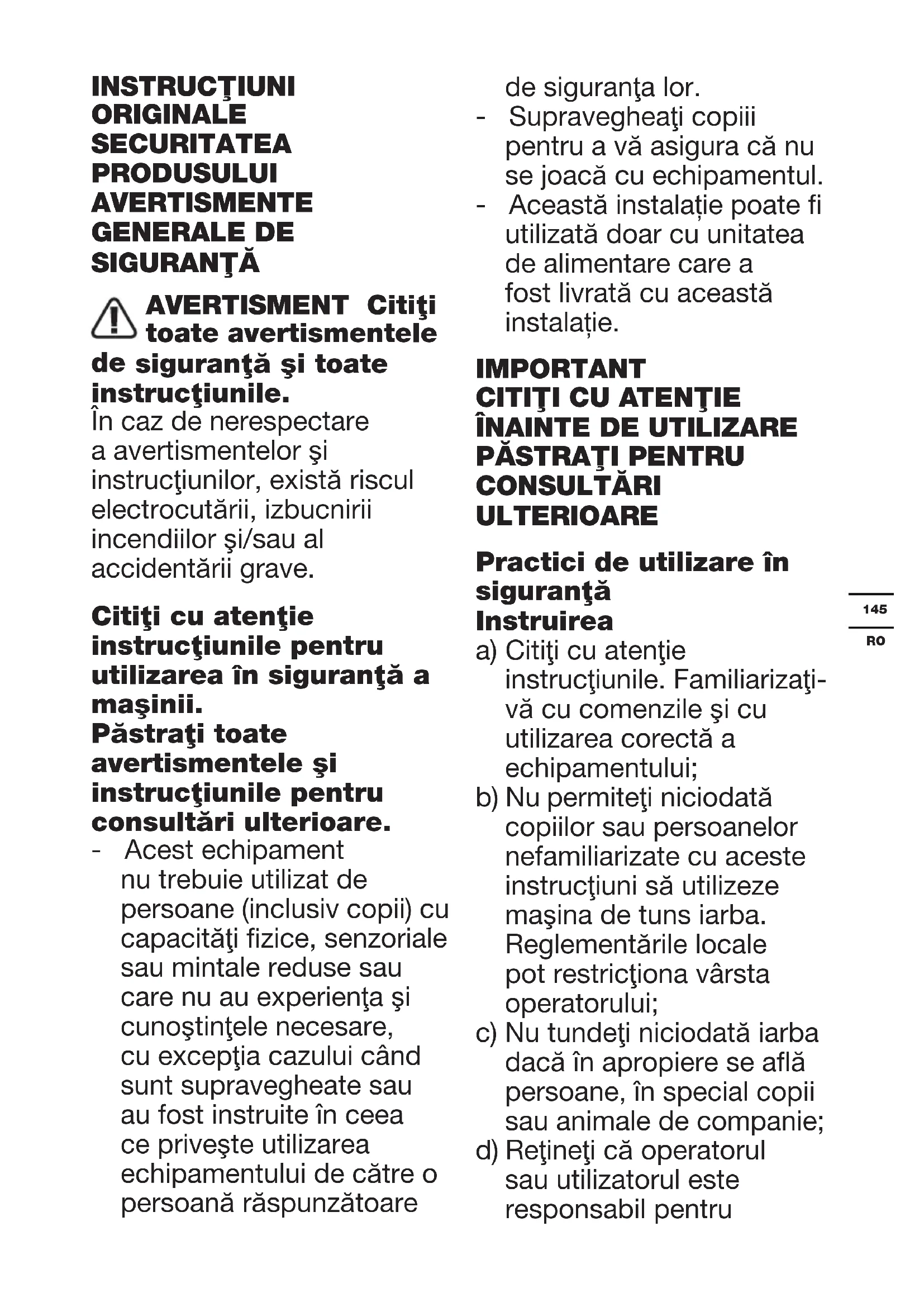 CONSULTĂRI ULTERIOARE Practici de utilizare în siguranţă Instruirea a) Citiţi cu atenţie instrucţiunile. Familiarizaţi- vă cu comenzile şi cu utilizarea corectă a echipamentului; b) Nu permiteţi niciodată copiilor sau persoanelor nefamiliarizate cu aceste instrucţiuni să utilizeze maşina de tuns iarba. Reglementările locale pot restricţiona vârsta operatorului; c) Nu tundeţi niciodată iarba dacă în apropiere se aă persoane, în special copii sau animale de companie; d) Reţineţi că operatorul sau utilizatorul este responsabil pentru146