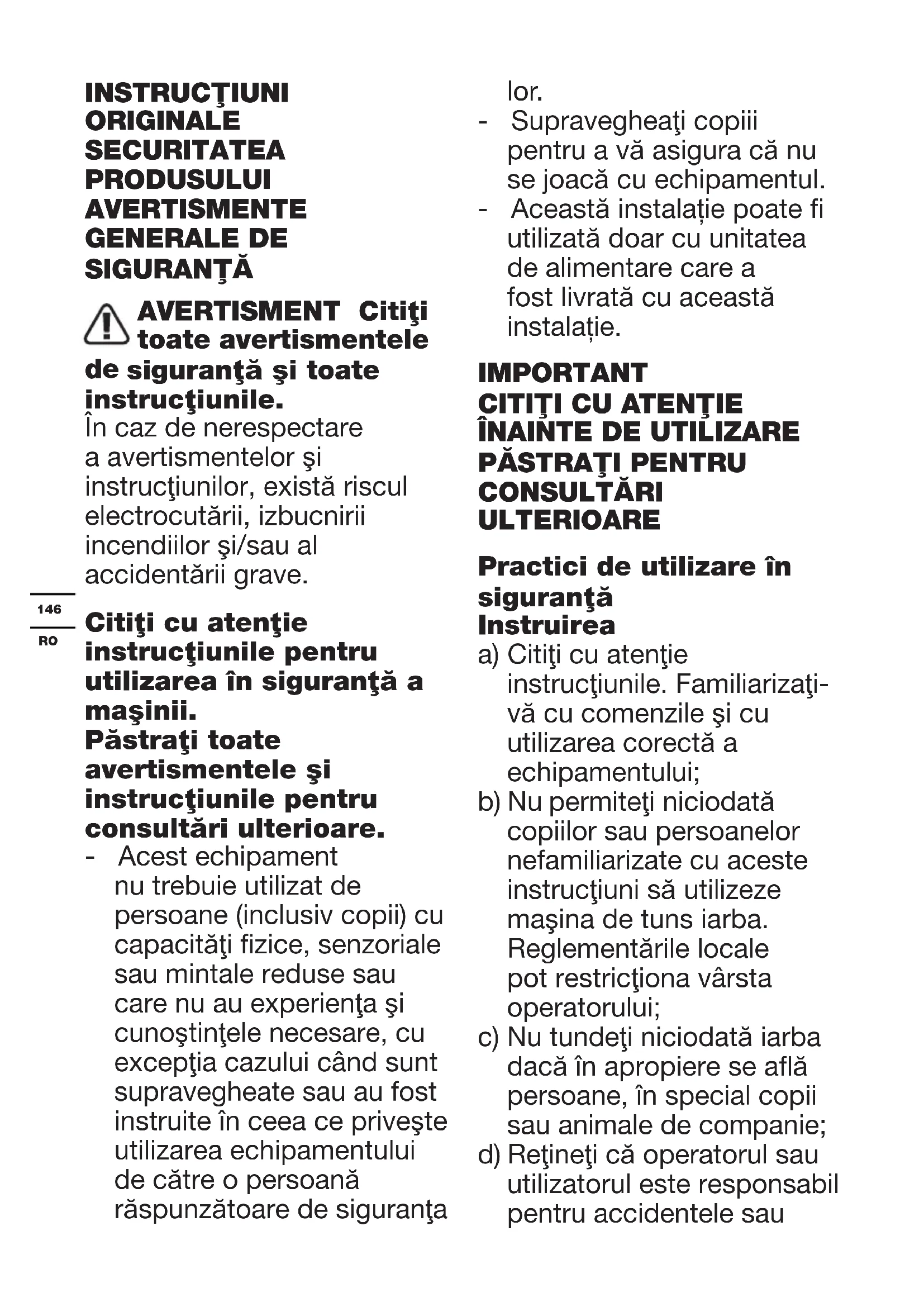 CONSULTĂRI ULTERIOARE Practici de utilizare în siguranţă Instruirea a) Citiţi cu atenţie instrucţiunile. Familiarizaţi- vă cu comenzile şi cu utilizarea corectă a echipamentului; b) Nu permiteţi niciodată copiilor sau persoanelor nefamiliarizate cu aceste instrucţiuni să utilizeze maşina de tuns iarba. Reglementările locale pot restricţiona vârsta operatorului; c) Nu tundeţi niciodată iarba dacă în apropiere se aă persoane, în special copii sau animale de companie; d) Reţineţi că operatorul sau utilizatorul este responsabil pentru accidentele sau147