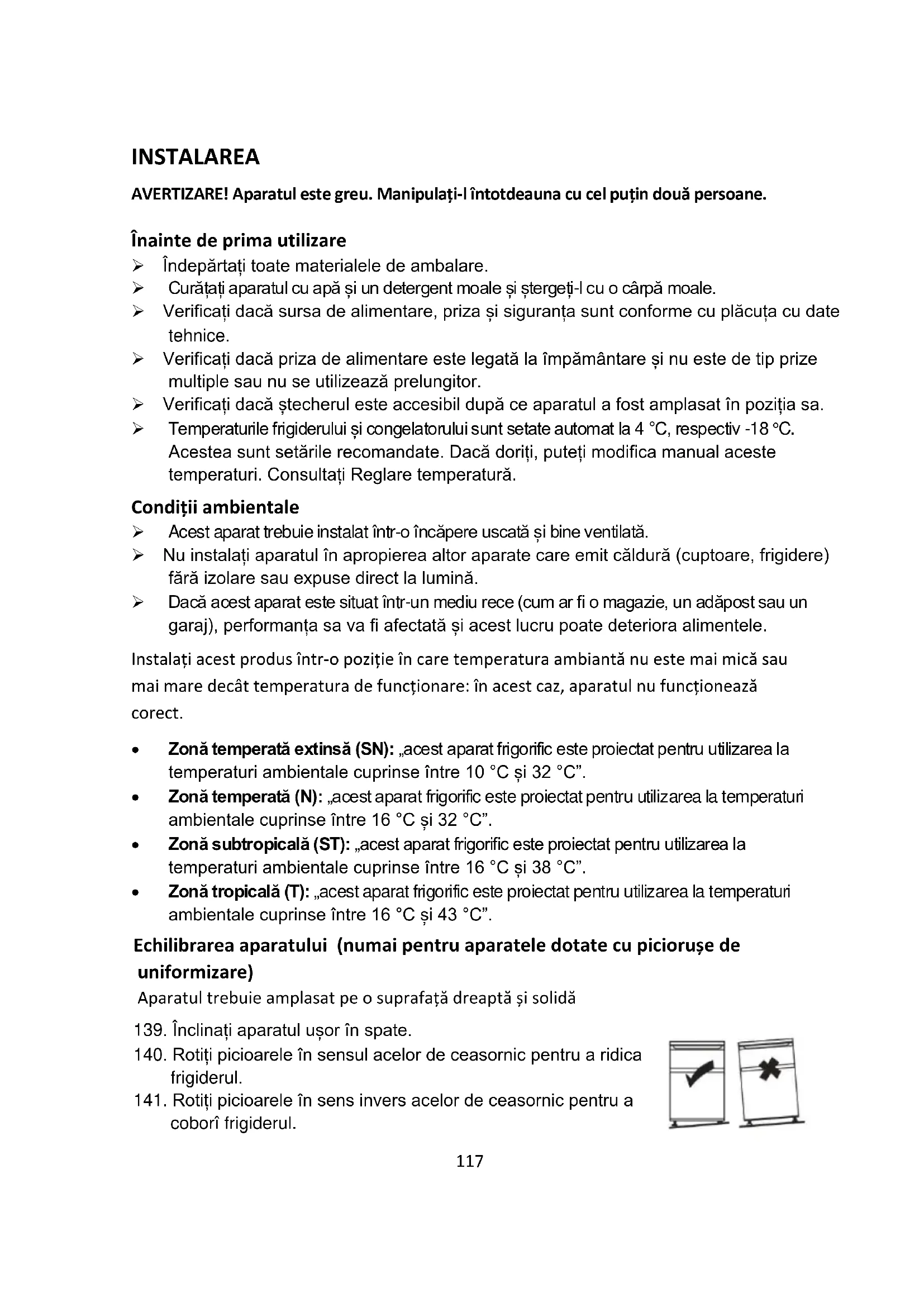 - Zonă tropicală (T): „acest aparat frigorific este proiectat pentru utilizarea la temperaturi ambientale cuprinse între 16 °C și 43 °C”. Echilibrarea aparatului (numai pentru aparatele dotate cu piciorușe de uniformizare) Aparatul trebuie amplasat pe o suprafață dreaptă și solidă