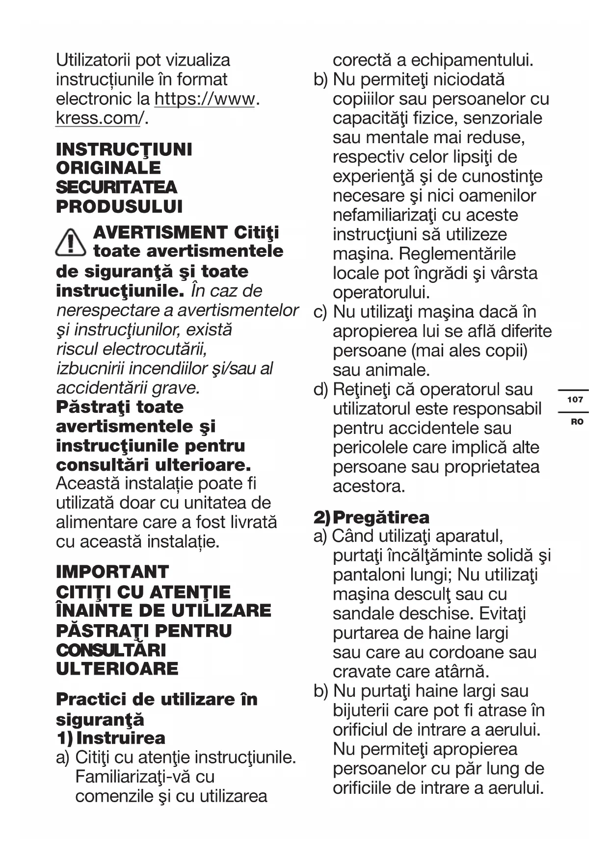 Utilizatorii pot vizualiza instrucțiunile în format electronic la https://www. kress.com/. INSTRUCŢIUNI ORIGINALE SECURITATEA PRODUSULUI AVERTISMENT Citiţi toate avertismentele de siguranţă şi toate instrucţiunile. În caz de nerespectare a avertismentelor şi instrucţiunilor, există riscul electrocutării, izbucnirii incendiilor şi/sau al accidentării grave. Păstraţi toate avertismentele şi instrucţiunile pentru consultări ulterioare. Această instalație poate utilizată doar cu unitatea de alimentare care a fost livrată cu această instalație. IMPORTANT