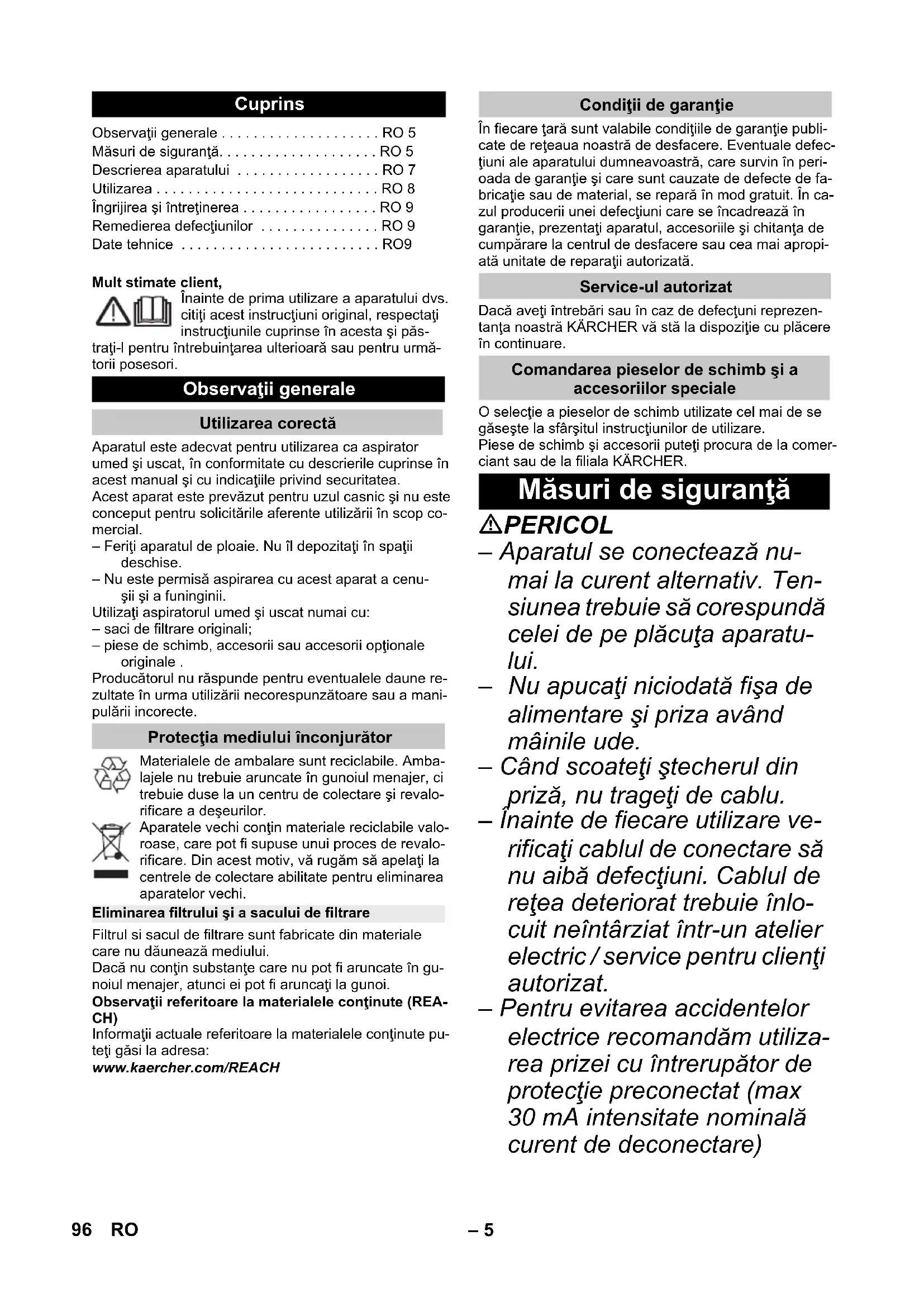 Kabel sieciowy H 05VV-F2x0,75 Ciężar (bez akcesoriów) 5,5 kg Poziom ciśnienia akustycznego (EN 60704-2-1) 75 dB(A) 95PL– 5 Mult stimate client, Înainte de prima utilizare a aparatului dvs. citiţi acest instrucţiuni original, respectaţi instrucţiunile cuprinse în acesta şi păs- traţi-l pentru întrebuinţarea ulterioară sau pentru urmă- torii posesori. Aparatul este adecvat pentru utilizarea ca aspirator umed şi uscat, în conformitate cu descrierile cuprinse în acest manual şi cu indicaţiile privind securitatea. Acest aparat este prevăzut pentru uzul casnic şi nu este conceput pentru solicitările aferente utilizării în scop co- mercial. – Feriţi aparatul de ploaie. Nu îl depozitaţi în spaţii deschise. – Nu este permisă aspirarea cu acest aparat a cenu- şii şi a funinginii. Utilizaţi aspiratorul umed şi uscat numai cu: – saci de filtrare originali; – piese de schimb, accesorii sau accesorii opţionale originale . Producătorul nu răspunde pentru eventualele daune re- zultate în urma utilizării necorespunzătoare sau a mani- pulării incorecte. Materialele de ambalare sunt reciclabile. Amba- lajele nu trebuie aruncate în gunoiul menajer, ci trebuie duse la un centru de colectare şi revalo- rificare a deşeurilor. Aparatele vechi conţin materiale reciclabile valo- roase, care pot fi supuse unui proces de revalo- rificare. Din acest motiv, vă rugăm să apelaţi la centrele de colectare abilitate pentru eliminarea aparatelor vechi. Filtrul si sacul de filtrare sunt fabricate din materiale care nu dăunează mediului. Dacă nu conţin substanţe care nu pot fi aruncate în gu- noiul menajer, atunci ei pot fi aruncaţi la gunoi. Observaţii referitoare la materialele conţinute (REA- CH) Informaţii actuale referitoare la materialele conţinute pu- teţi găsi la adresa: www.kaercher.com/REACH În fiecare ţară sunt valabile condiţiile de garanţie publi- cate de reţeaua noastră de desfacere. Eventuale defec- ţiuni ale aparatului dumneavoastră, care survin în peri- oada de garanţie şi care sunt cauzate de defecte de fa- bricaţie sau de material, se repară în mod gratuit. În ca- zul producerii unei defecţiuni care se încadrează în garanţie, prezentaţi aparatul, accesoriile şi chitanţa de cumpărare la centrul de desfacere sau cea mai apropi- ată unitate de reparaţii autorizată. Dacă aveţi întrebări sau în caz de defecţuni reprezen- tanţa noastră KÄRCHER vă stă la dispoziţie cu plăcere în continuare. O selecţie a pieselor de schimb utilizate cel mai de se găseşte la sfârşitul instrucţiunilor de utilizare. Piese de schimb şi accesorii puteţi procura de la comer- ciant sau de la filiala KÄRCHER. PERICOL – Aparatul se conectează nu- mai la curent alternativ. Ten- siunea trebuie să corespundă celei de pe plăcuţa aparatu- lui. – Nu apucaţi niciodată fişa de alimentare şi priza având mâinile ude. – Când scoateţi ştecherul din priză, nu trageţi de cablu. – Înainte de fiecare utilizare ve- rificaţi cablul de conectare să nu aibă defecţiuni. Cablul de reţea deteriorat trebuie înlo- cuit neîntârziat într-un atelier electric / service pentru clienţi autorizat. – Pentru evitarea accidentelor electrice recomandăm utiliza- rea prizei cu întrerupător de protecţie preconectat (max 30 mA intensitate nominală curent de deconectare) Cuprins Observaţii generale . . . . . . . . . . . . . . . . . . . . RO 5 Măsuri de siguranţă. . . . . . . . . . . . . . . . . . . . RO 5 Descrierea aparatului . . . . . . . . . . . . . . . . . . RO 7 Utilizarea . . . . . . . . . . . . . . . . . . . . . . . . . . . . RO 8 Îngrijirea şi întreţinerea . . . . . . . . . . . . . . . . . RO 9 Remedierea defecţiunilor . . . . . . . . . . . . . . . RO 9 Date tehnice . . . . . . . . . . . . . . . . . . . . . . . . . RO9 Observaţii generale Utilizarea corectă Protecţia mediului înconjurător Eliminarea filtrului şi a sacului de filtrare Condiţii de garanţie Service-ul autorizat Comandarea pieselor de schimb şi a accesoriilor speciale Măsuri de siguranţă 96 RO– 6 – Înainte de orice lucrare de în- grijire şi întreţinere decuplaţi aparatul şi scoateţi fişa cablu- lui de alimentare din priză. – Efectuarea lucrărilor de repa- raţii precum şi a celor la an- samblurile electrice este per- misă numai service-ului auto- rizat pentru clienţi. AVERTIZARE – Aparatul nu este destinat pentru a fi folosit de persoane cu capacităţi psihice, senzori- ale sau mintale limitate sau de persoane, care nu dispun de experienţa şi/sau cunoş- tinţa necesară, cu excepţia acelor cazuri, în care ele sunt supravegheate de o persoa- nă responsabilă de siguranţa lor sau au fost instruite de că- tre această persoană în pri- vinţa utilizării aparatului şi sunt conştiente de pericolele care rezultă din aceasta. – Copii pot utiliza aparatul doar dacă au împlinit 8 ani şi sunt supravegheaţi de o persoană responsabilă de siguranţa lor