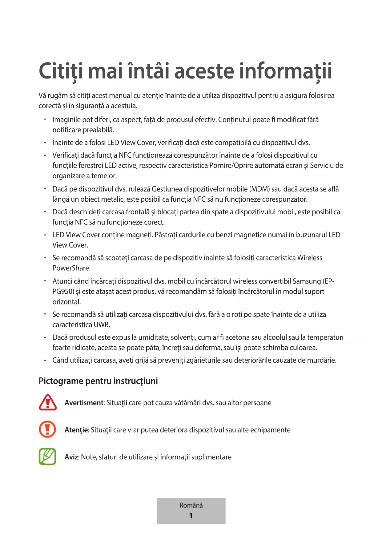 Când utilizați carcasa, aveți grijă să preveniți zgârieturile sau deteriorările cauzate de murdărie. Pictograme pentru instrucţiuni Avertisment: Situaţii care pot cauza vătămări dvs. sau altor persoane Atenţie: Situaţii care v-ar putea deteriora dispozitivul sau alte echipamente Aviz: Note, sfaturi de utilizare şi informaţii suplimentare Română