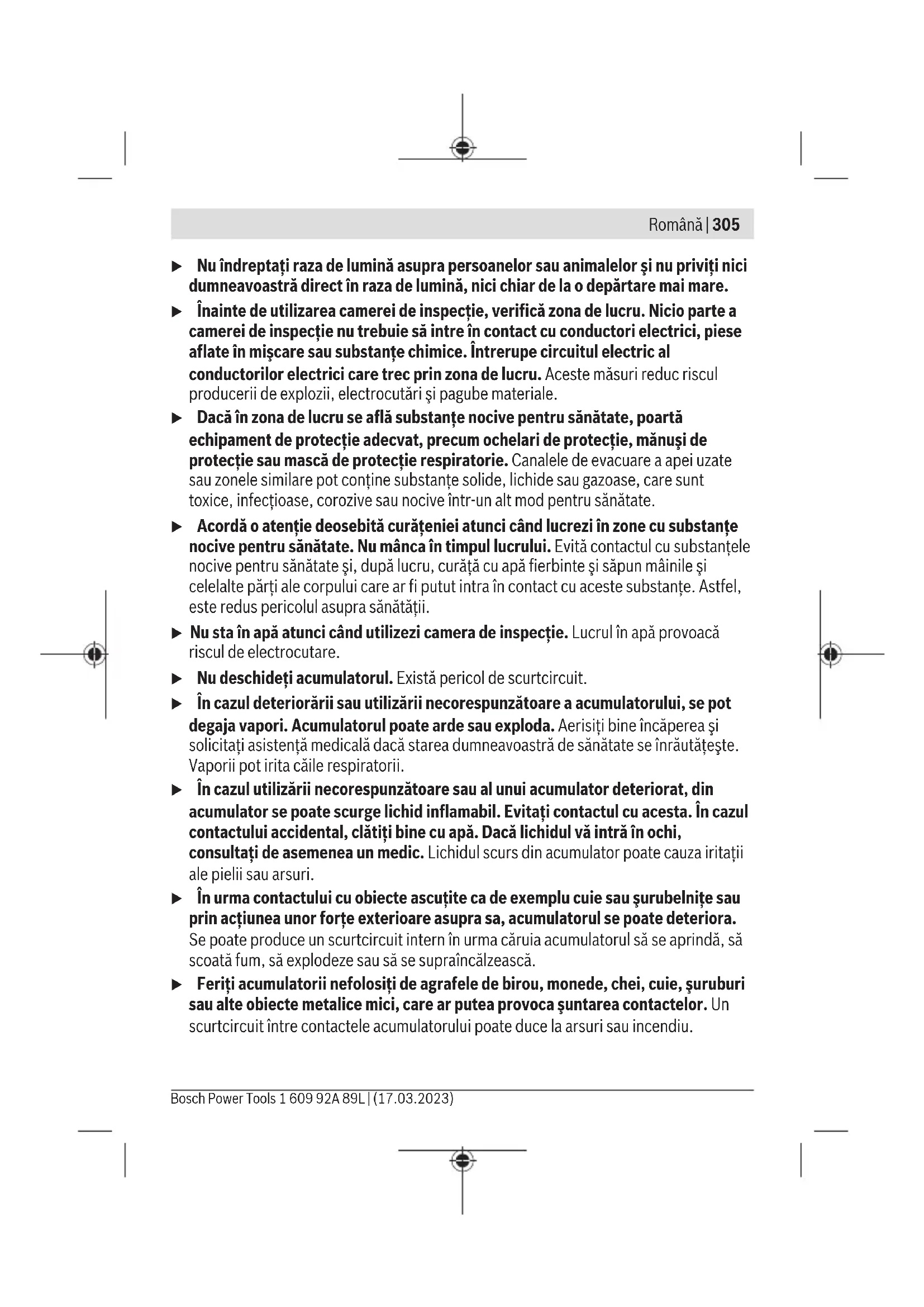 Ұсынылған литий-иондық аккумуляторлар қауіпті тауарларға қойылатын талаптарға бағынады. Пайдаланушы аккумуляторларды көшеде қосымша құжаттарсыз тасымалдай алады. Үшінші тұлғалар (мысалы, әуе көлігі немесе жіберу) орамаға және маркаларға қойылатын арнайы талаптарды сақтау керек. Жіберуге дайындау кезінде қауіпті жүктерді тасымалдау маманымен хабарласу керек. Аккумуляторды корпусы зақымдалған болса ғана жіберіңіз. Ашық түйіспелерді желімдеңіз және аккумуляторды орамада қозғалмайтындай ораңыз. Қажет болса, қосымша ұлттық ережелерді сақтаңыз. Кәдеге жарату Тексеру камерасын, батареяларды/аккумуляторларды, керек- жарақтарды және орауыш материалдарын қоршаған орта үшін қауіпсіз жолмен кәдеге жарату орындарына тапсыру керек. Тексеру камерасын және батареяларды/аккумуляторларды тұрмыстық қоқысқа тастамаңыз! Bosch Power Tools 1 609 92A 89L | (17.03.2023)304 | Română Тек қана ЕО елдері үшін: 2012/19/EU еуропалық директивасы бойынша істен шыққан тексеру камераларын және 2006/66/EC еуропалық директивасы бойынша ақаулы немесе ескі аккумуляторларды/батареяларды бөлек жинау және қоршаған орта үшін қауіпсіз жолмен қайта өңдеу орнына тапсыру қажет. Қате жолмен кәдеге жаратылған ескі электрлік және электрондық құрылғылар қауіпті заттардың болу мүмкіндігіне байланысты қоршаған ортаға және адам денсаулығына зиянды әсер тигізуі мүмкін. Аккумуляторлар/батареялар: Литий-иондық: Тасымалдау бөліміндегі нұсқауларды орындаңыз (қараңыз „Тасымалдау“, Бет303). Кіріктірілген түймелі элементті кәдеге жаратуға тек білікті мамандарға шығаруға рұқсат етіледі. Română Instrucţiuni de siguranţă Toate instrucţiunile trebuie citite şi respectate. Dacă camera de inspecţie nu este utilizată conform acestor instrucţiuni, dispozitivele de protecţie integrate în aceasta pot fi perturbate. PĂSTREAZĂ ÎN CONDIŢII OPTIME ACESTE INSTRUCŢIUNI. u Nu permite repararea camerei de inspecţie decât de către personal de specialitate calificat şi numai cu piese de schimb originale. Numai în acest mod poate fi garantată siguranţa camerei de inspecţie. u Nu utiliza camera de inspecţie în medii cu risc de explozii, în care se află lichide inflamabile, gaze sau pulberi. În camera de inspecţie se pot produce scântei care pot aprinde praful sau vaporii. u Înaintea oricăror intervenţii asupra camerei de inspecţie (de exemplu, montare, întreţinere etc.), cât şi în timpul transportului şi depozitării, scoate acumulatorul din aceasta. u Scoate bateriile din camera de inspecţie dacă urmează să nu o utilizezi pentru o perioadă mai îndelungată de timp. În cazul depozitării mai îndelungate, bateriile se pot coroda şi autodescărca. 1 609 92A 89L | (17.03.2023) Bosch Power ToolsRomână | 305 u Nu îndreptaţi raza de lumină asupra persoanelor sau animalelor şi nu priviţi nici dumneavoastră direct în raza de lumină, nici chiar de la o depărtare mai mare. u Înainte de utilizarea camerei de inspecţie, verifică zona de lucru. Nicio parte a camerei de inspecţie nu trebuie să intre în contact cu conductori electrici, piese aflate în mişcare sau substanţe chimice. Întrerupe circuitul electric al conductorilor electrici care trec prin zona de lucru. Aceste măsuri reduc riscul producerii de explozii, electrocutări şi pagube materiale. u Dacă în zona de lucru se află substanţe nocive pentru sănătate, poartă echipament de protecţie adecvat, precum ochelari de protecţie, mănuşi de protecţie sau mască de protecţie respiratorie. Canalele de evacuare a apei uzate sau zonele similare pot conţine substanţe solide, lichide sau gazoase, care sunt toxice, infecţioase, corozive sau nocive într-un alt mod pentru sănătate. u Acordă o atenţie deosebită curăţeniei atunci când lucrezi în zone cu substanţe nocive pentru sănătate. Nu mânca în timpul lucrului. Evită contactul cu substanţele nocive pentru sănătate şi, după lucru, curăţă cu apă fierbinte şi săpun mâinile şi celelalte părţi ale corpului care ar fi putut intra în contact cu aceste substanţe. Astfel, este redus pericolul asupra sănătăţii. u Nu sta în apă atunci când utilizezi camera de inspecţie. Lucrul în apă provoacă riscul de electrocutare. u Nu deschideţi acumulatorul. Există pericol de scurtcircuit. u În cazul deteriorării sau utilizării necorespunzătoare a acumulatorului, se pot degaja vapori. Acumulatorul poate arde sau exploda. Aerisiţi bine încăperea şi solicitaţi asistenţă medicală dacă starea dumneavoastră de sănătate se înrăutăţeşte. Vaporii pot irita căile respiratorii. u În cazul utilizării necorespunzătoare sau al unui acumulator deteriorat, din acumulator se poate scurge lichid inflamabil. Evitaţi