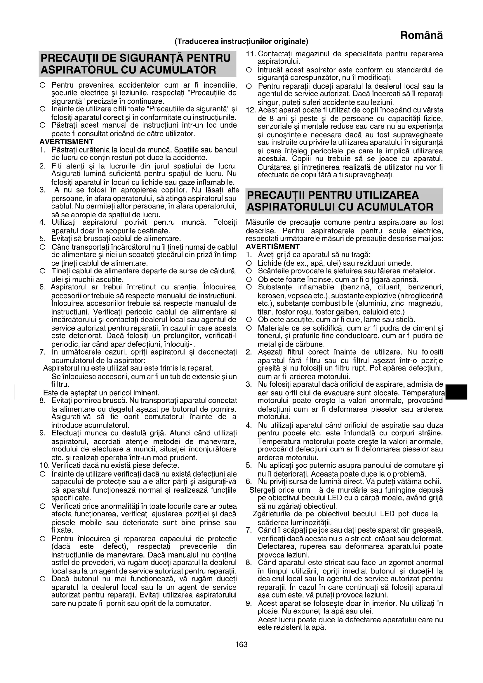 ○ Înainte de utilizare verifi caţi dacă nu există defecţiuni ale capacului de protecţie sau ale altor părţi şi asiguraţ i-vă că aparatul funcţionează normal şi realizează funcţiile specifi cate. ○ Verifi caţi orice anormalităţi în toate locurile care ar putea afecta funcţionarea, verifi caţi ajustarea poziţiei şi dacă piesele mobile sau deteriorate sunt bine prinse sau fi xate. ○ Pentru înlocuirea şi repararea capacului de protecţie (dacă este defect), respectaţi prevederile din instrucţiunile de manevrare. Dacă manualul nu conţine astfel de prevederi, vă rugăm duceţi aparatul la dealerul local sau la un agent de service autorizat pentru reparaţii. ○ Dacă butonul nu mai funcţionează, vă rugăm duceţi aparatul la dealerul local sau la un agent de service autorizat pentru reparaţii. Evitaţi utilizarea aspiratorului care nu poate fi pornit sau oprit de la comutator. (Traducerea instrucţiunilor originale) 000BookR36DBEU.indb163000BookR36DBEU.indb163 2022/06/1514:07:402022/06/1514:07:40164 Română AVERTISMENTE SUPLIMENTARE