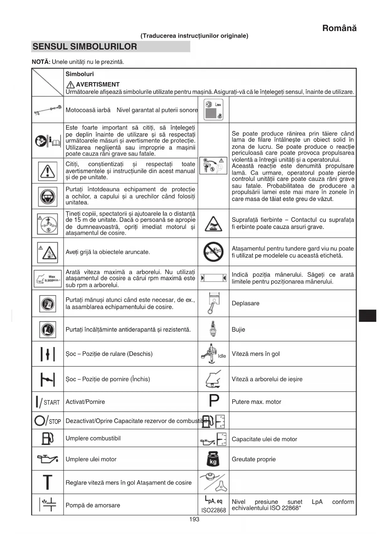 (Traducerea instrucţiunilor originale) SENSUL SIMBOLURILOR NOTĂ: Unele unităţi nu le prezintă. Simboluri AVERTISMENT Următoarele afi șează simbolurile utilizate pentru mașină. Asiguraţi-vă că le înţelegeţi sensul, înainte de utilizare. Motocoasă iarbă Nivel garantat al puterii sonore Este foarte important să citiţi, să înţelegeţi pe deplin înainte de utilizare și să respectaţi următoarele măsuri și avertismente de protecţie. Utilizarea neglijentă sau improprie a mașinii poate cauza răni grave sau fatale. Se poate produce rănirea prin tăiere când lama de fi lare întâlnește un obiect solid în zona de lucru. Se poate produce o reacţie periculoasă care poate provoca propulsarea violentă a întregii unităţi și a operatorului. Această reacţie este denumită propulsare lamă. Ca urmare, operatorul poate pierde controlul unităţii care poate cauza răni grave sau fatale. Probabilitatea de producere a propulsării lamei este mai mare în zonele în care masa de tăiat este greu de văzut. Citiţi, conștientizaţi și respectaţi toate avertismentele și instrucţiunile din acest manual și de pe unitate. Purtaţi întotdeauna echipament de protecţie a ochilor, a capului și a urechilor când folosiţi unitatea. Ţineţi copiii, spectatorii și ajutoarele la o distanţă de 15 m de unitate. Dacă o persoană se apropie de dumneavoastră, opriţi imediat motorul și atașamentul de cosire. Suprafaţă fi erbinte – Contactul cu suprafaţa fi erbinte poate cauza arsuri grave. Aveţi grijă la obiectele aruncate. Atașamentul pentru tundere gard viu nu poate fi utilizat pe modelele cu această etichetă. min
