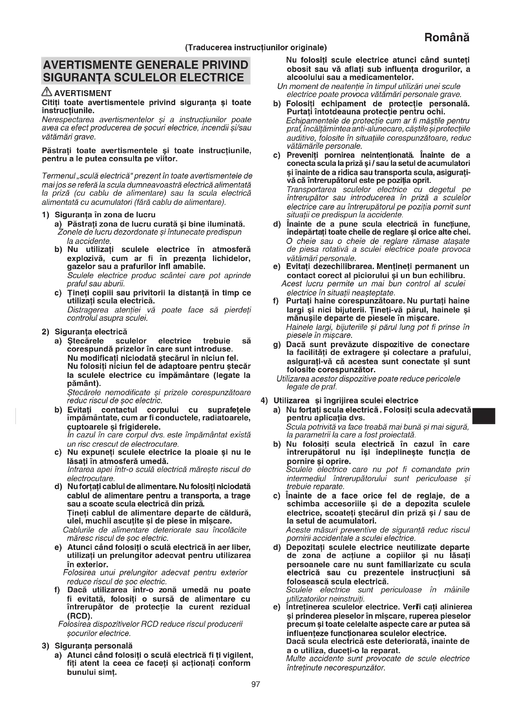 AVERTISMENT Citiţi toate avertismentele privind siguranţa și toate instrucţiunile. Nerespectarea avertismentelor și a instrucţiunilor poate avea ca efect producerea de șocuri electrice, incendii și/sau vătămări grave. Păstraţi toate avertismentele și toate instrucţiunile, pentru a le putea consulta pe viitor. Termenul „sculă electrică“ prezent în toate avertismentele de mai jos se referă la scula dumneavoastră electrică alimentată la priză (cu cablu de alimentare) sau la scula electrică alimentată cu acumulatori (fără cablu de alimentare).