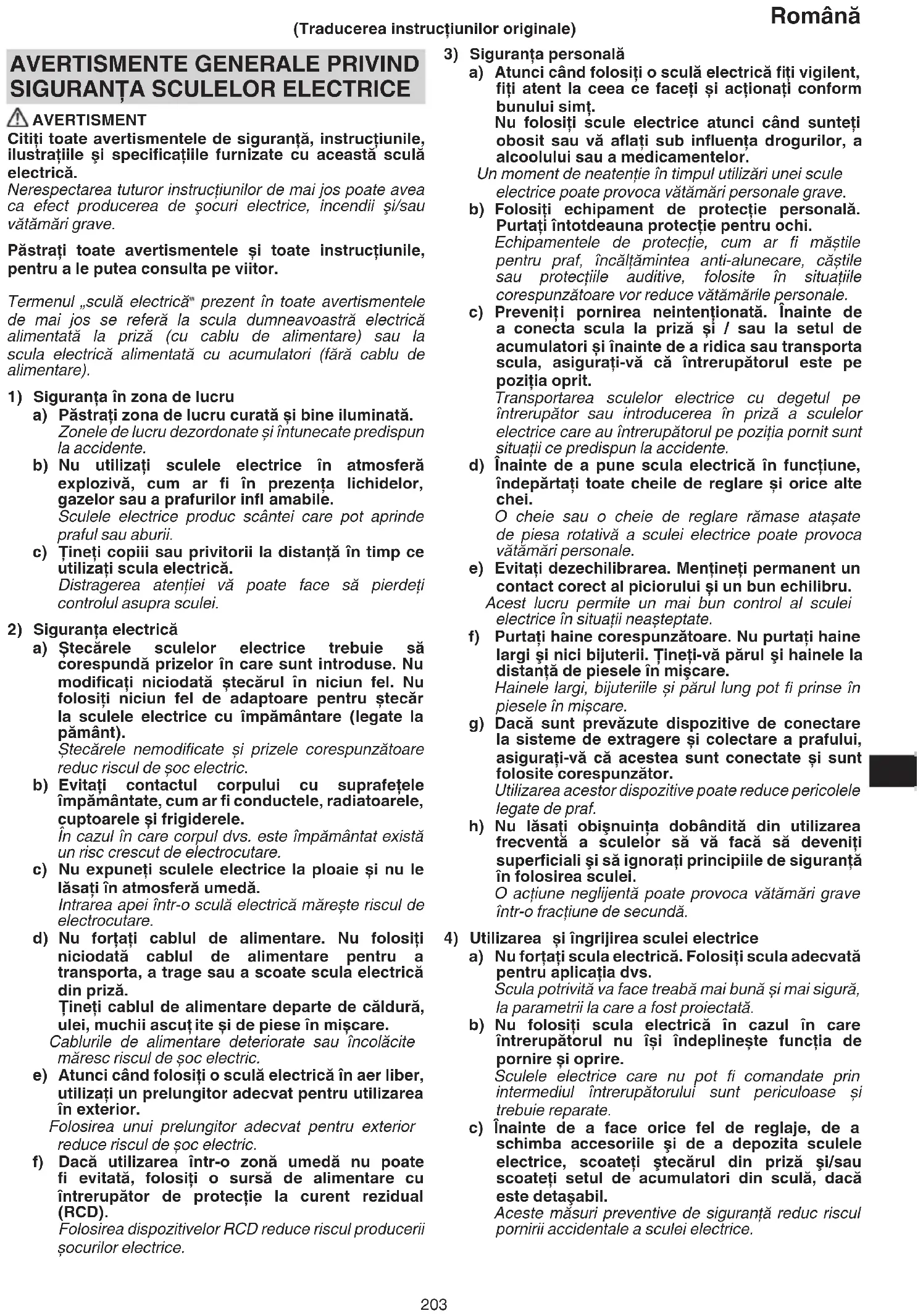 AVERTISMENT Citiţi toate avertismentele de siguranţă, instrucţiunile, ilustraţiile şi specifi caţiile furnizate cu această sculă electrică. Nerespectarea tuturor instrucţiunilor de mai jos poate avea ca efect producerea de şocuri electrice, incendii şi/sau vătămări grave. Păstraţi toate avertismentele și toate instrucţiunile, pentru a le putea consulta pe viitor. Termenul „sculă electrică prezent în toate avertismentele de mai jos se referă la scula dumneavoastră electrică alimentată la priză (cu cablu de alimentare) sau la scula electrică alimentată cu acumulatori (fără cablu de alimentare).