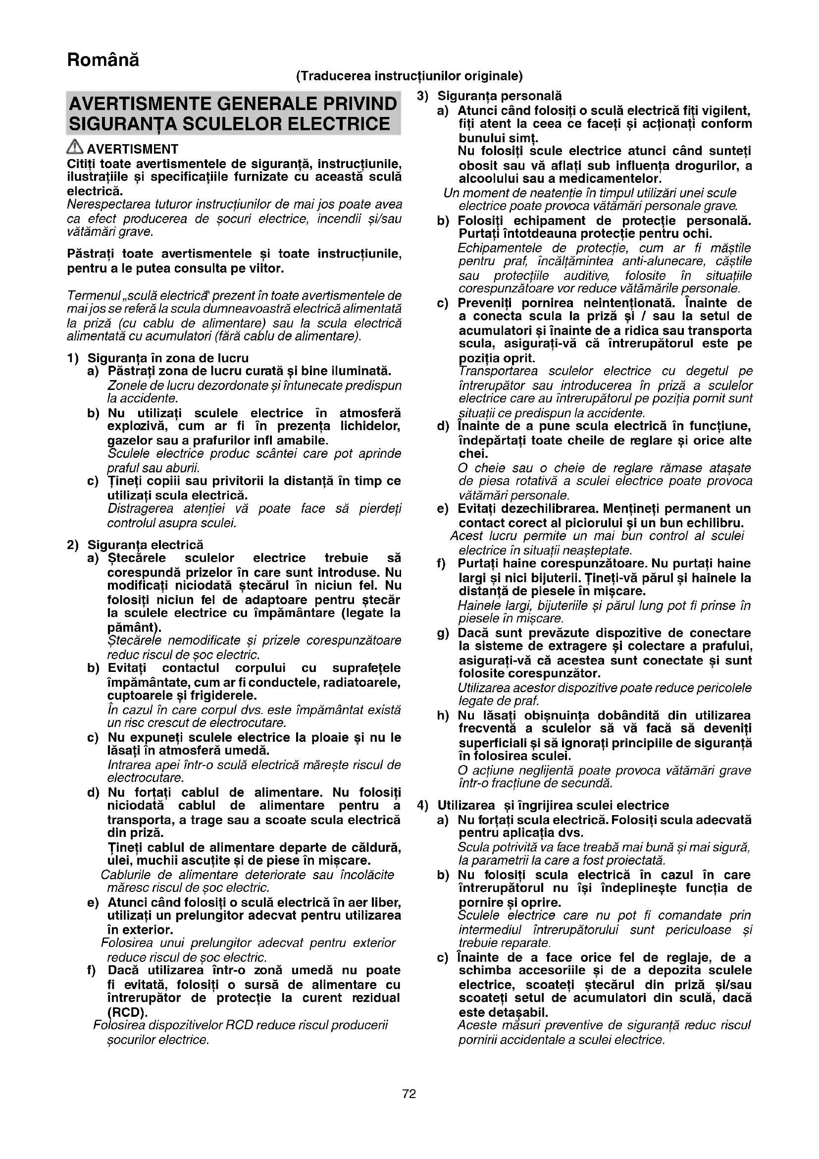AVERTISMENT Citiţi toate avertismentele de siguranţă, instrucţiunile, ilustraţiile și specifi caţiile furnizate cu această sculă electrică. Nerespectarea tuturor instrucţiunilor de mai jos poate avea ca efect producerea de șocuri electrice, incendii și/sau vătămări grave. Păstraţi toate avertismentele și toate instrucţiunile, pentru a le putea consulta pe viitor. Termenul „sculă electrică prezent în toate avertismentele de mai jos se referă la scula dumneavoastră electrică alimentată la priză (cu cablu de alimentare) sau la scula electrică alimentată cu acumulatori (fără cablu de alimentare).