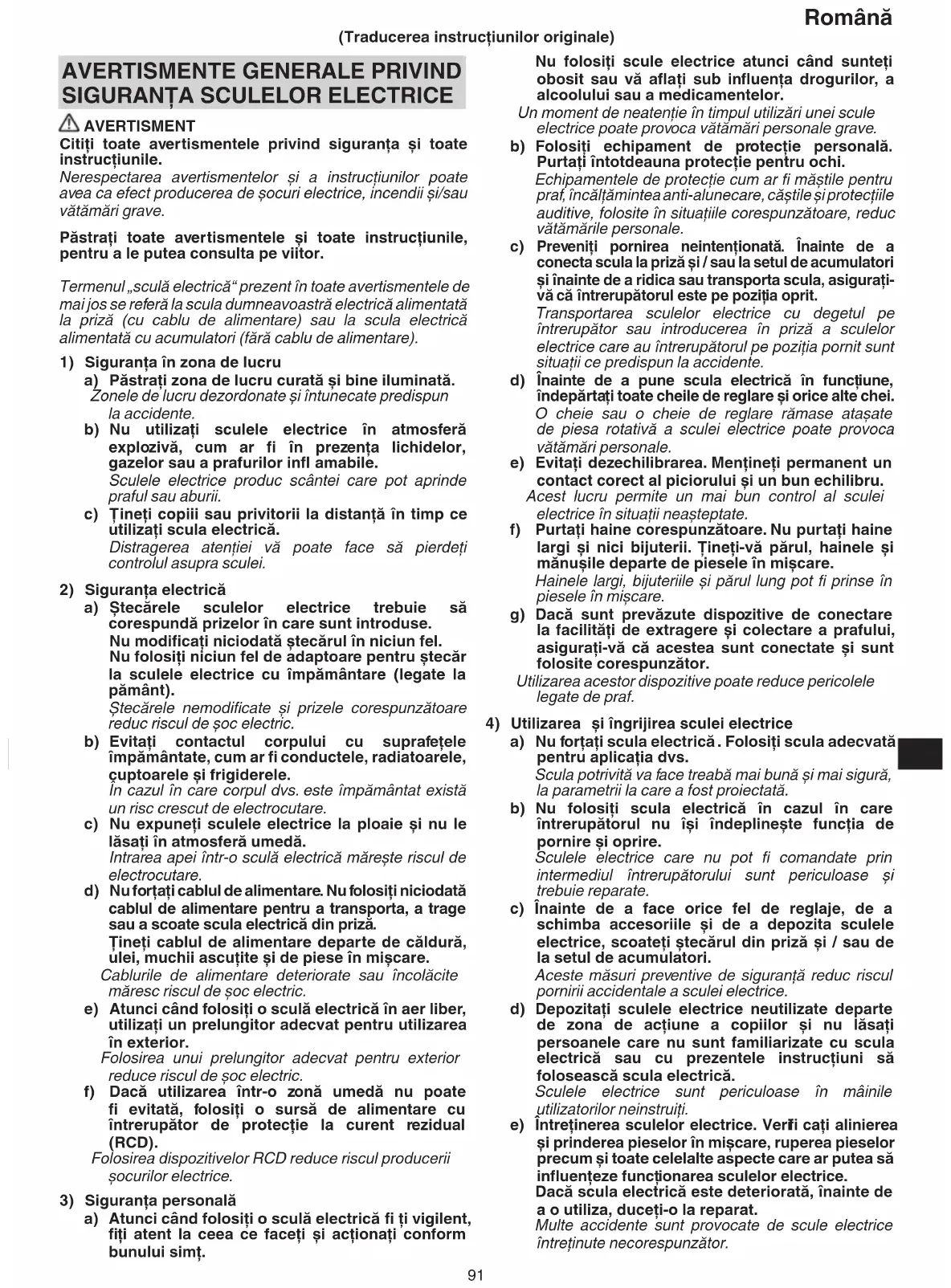 AVERTISMENT Citiţi toate avertismentele privind siguranţa și toate instrucţiunile. Nerespectarea avertismentelor și a instrucţiunilor poate avea ca efect producerea de șocuri electrice, incendii și/sau vătămări grave. Păstraţi toate avertismentele și toate instrucţiunile, pentru a le putea consulta pe viitor. Termenul „sculă electrică“ prezent în toate avertismentele de mai jos se referă la scula dumneavoastră electrică alimentată la priză (cu cablu de alimentare) sau la scula electrică alimentată cu acumulatori (fără cablu de alimentare).