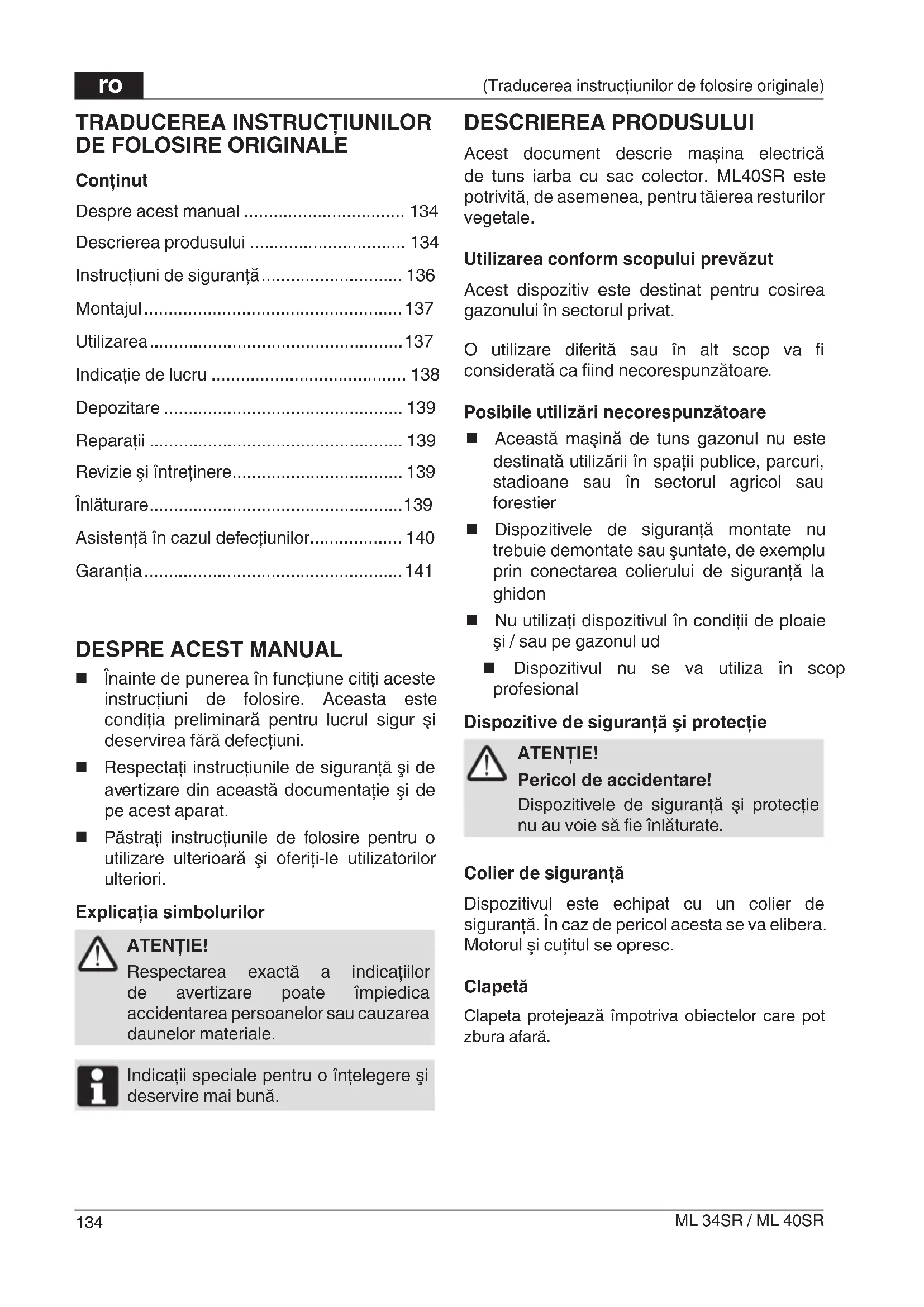 Înainte de punerea în funcţiune citiţi aceste instrucţiuni de folosire. Aceasta este condiţia preliminară pentru lucrul sigur şi deservirea fără defecţiuni. Respectaţi instrucţiunile de siguranţă şi de avertizare din această documentaţie şi de pe acest aparat. Păstraţi instrucţiunile de folosire pentru o utilizare ulterioară şi oferiţi-le utilizatorilor ulteriori. Explicaţia simbolurilor ATENŢIE! Respectarea exactă a indicaţiilor de avertizare poate împiedica accidentarea persoanelor sau cauzarea daunelor materiale. Indicaţii speciale pentru o înţelegere şi deservire mai bună. DESCRIEREA PRODUSULUI Acest document descrie mașina electrică de tuns iarba cu sac colector. ML40SR este potrivită, de asemenea, pentru tăierea resturilor vegetale. Utilizarea conform scopului prevăzut Acest dispozitiv este destinat pentru cosirea gazonului în sectorul privat. O utilizare diferită sau în alt scop va fi considerată ca fi ind necorespunzătoare. Posibile utilizări necorespunzătoare Această maşină de tuns gazonul nu este destinată utilizării în spaţii publice, parcuri, stadioane sau în sectorul agricol sau forestier Dispozitivele de siguranţă montate nu trebuie demontate sau şuntate, de exemplu prin conectarea colierului de siguranţă la ghidon Nu utilizaţi dispozitivul în condiţii de ploaie şi / sau pe gazonul ud Dispozitivul nu se va utiliza în scop profesional Dispozitive de siguranţă şi protecţie ATENŢIE! Pericol de accidentare! Dispozitivele de siguranţă şi protecţie nu au voie să fi e înlăturate. Colier de siguranţă Dispozitivul este echipat cu un colier de siguranţă. În caz de pericol acesta se va elibera. Motorul şi cuţitul se opresc. Clapetă Clapeta protejează împotriva obiectelor care pot zbura afară. 0000BookML34SR.indb1340000BookML34SR.indb134 2017/12/0814:20:542017/12/0814:20:54ro