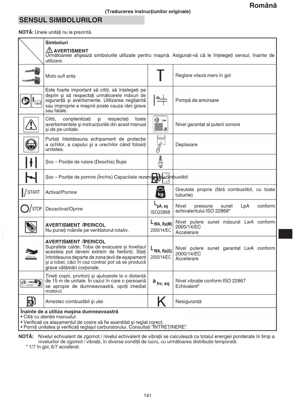 (Traducerea instrucţiunilor originale) SENSUL SIMBOLURILOR NOTĂ: Unele unităţi nu le prezintă. Simboluri AVERTISMENT Următoarele afi şează simbolurile utilizate pentru maşină. Asiguraţi-vă că le înţelegeţi sensul, înainte de utilizare. Moto sufl anta Reglare viteză mers în gol Este foarte important să citiţi, să înţelegeţi pe deplin şi să respectaţi următoarele măsuri de siguranţă şi avertismente. Utilizarea neglijentă sau improprie a maşinii poate cauza răni grave sau fatale. Pompă de amorsare Citiţi, conştientizaţi şi respectaţi toate avertismentele şi instrucţiunile din acest manual şi de pe unitate. Nivel garantat al puterii sonore Purtaţi întotdeauna echipament de protecţie a ochilor, a capului şi a urechilor când folosiţi unitatea. Deplasare Șoc – Poziţie de rulare (Deschis) Bujie Șoc – Poziţie de pornire (Închis) Capacitate rezervor de combustibil START Activat/Pornire Greutate proprie (fără combustibil, cu toate tuburile) STOP Dezactivat/Oprire