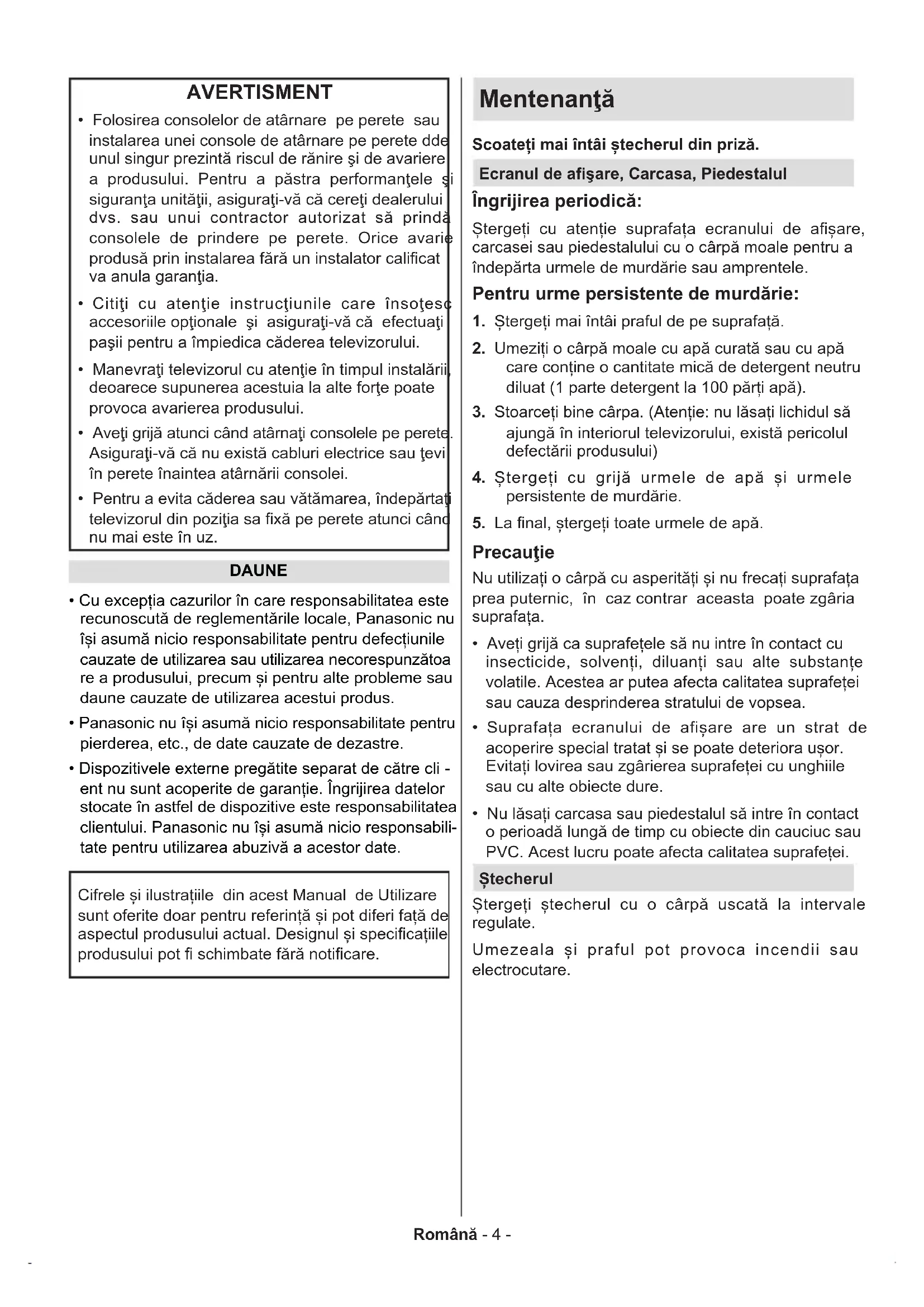 - Cu excepția cazurilor în care responsabilitatea este recunoscută de reglementările locale, Panasonic nu își asumă nicio responsabilitate pentru defecțiunile cauzate de utilizarea sau utilizarea necorespunzătoa