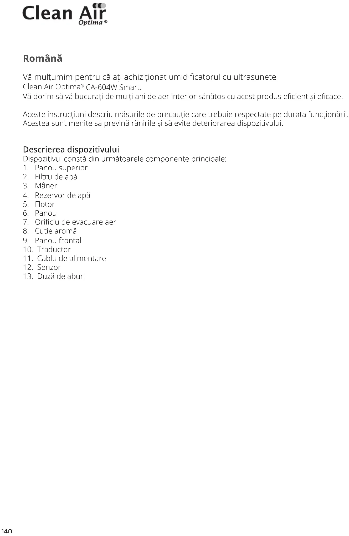 CA-604W Smart / Displej140 Română Vă mulțumim pentru că ați achiziționat umidicatorul cu ultrasunete Clean Air Optima