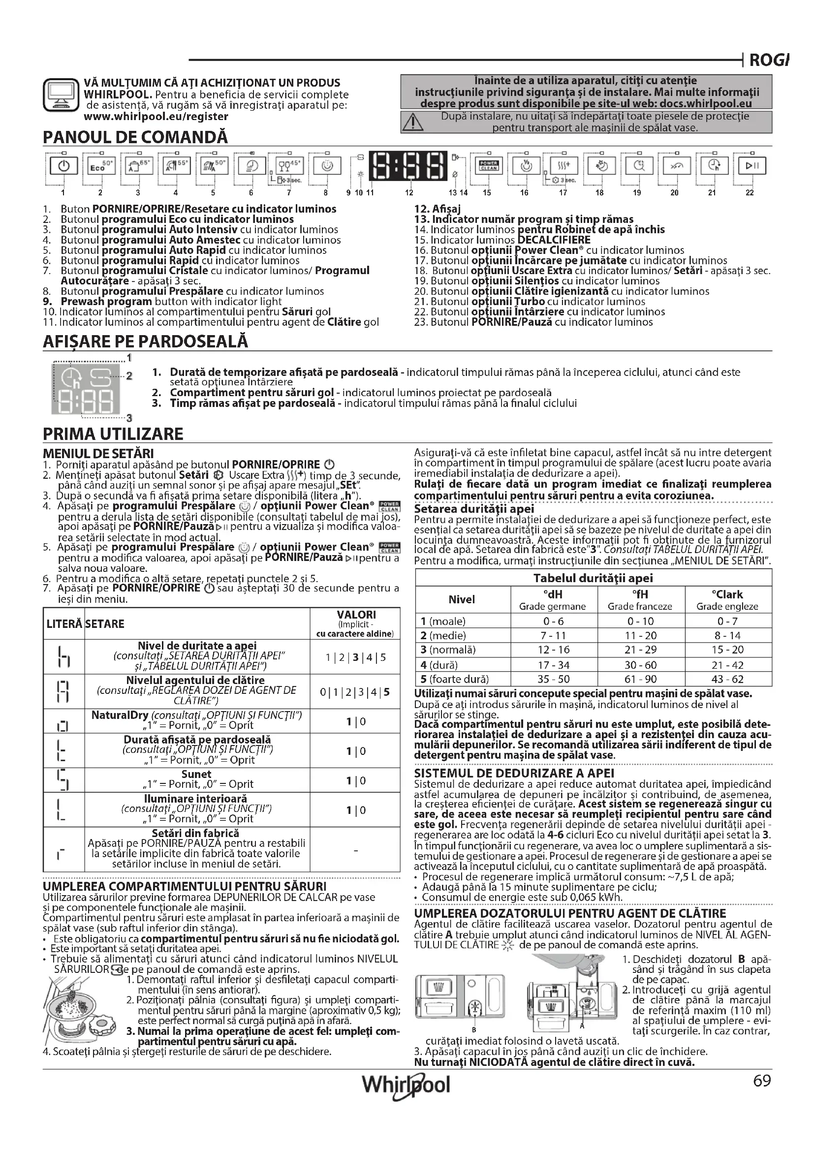 VĂ MULŢUMIM CĂ AŢI ACHIZIŢIONAT UN PRODUS WHIRLPOOL. Pentru a beneficia de servicii complete de asistenţă, vă rugăm să vă înregistraţi aparatul pe: www.whirlpool.eu/register Înainte de a utiliza aparatul, citiţi cu atenţie instrucţiunile privind siguranţa şi de instalare. Mai multe informaţii despre produs sunt disponibile pe site-ul web: docs.whirlpool.eu După instalare, nu uitaţi să îndepărtaţi toate piesele de protecţie pentru transport ale maşinii de spălat vase.