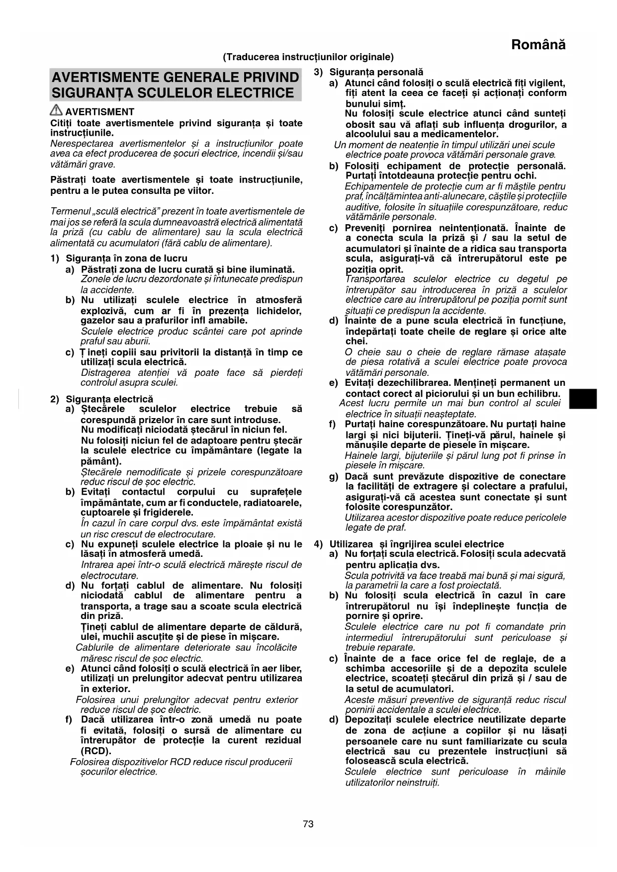 AVERTISMENT Citiţi toate avertismentele privind siguranţa și toate instrucţiunile. Nerespectarea avertismentelor și a instrucţiunilor poate avea ca efect producerea de șocuri electrice, incendii și/sau vătămări grave. Păstraţi toate avertismentele și toate instrucţiunile, pentru a le putea consulta pe viitor. Termenul „sculă electrică” prezent în toate avertismentele de mai jos se referă la scula dumneavoastră electrică alimentată la priză (cu cablu de alimentare) sau la scula electrică alimentată cu acumulatori (fără cablu de alimentare).
