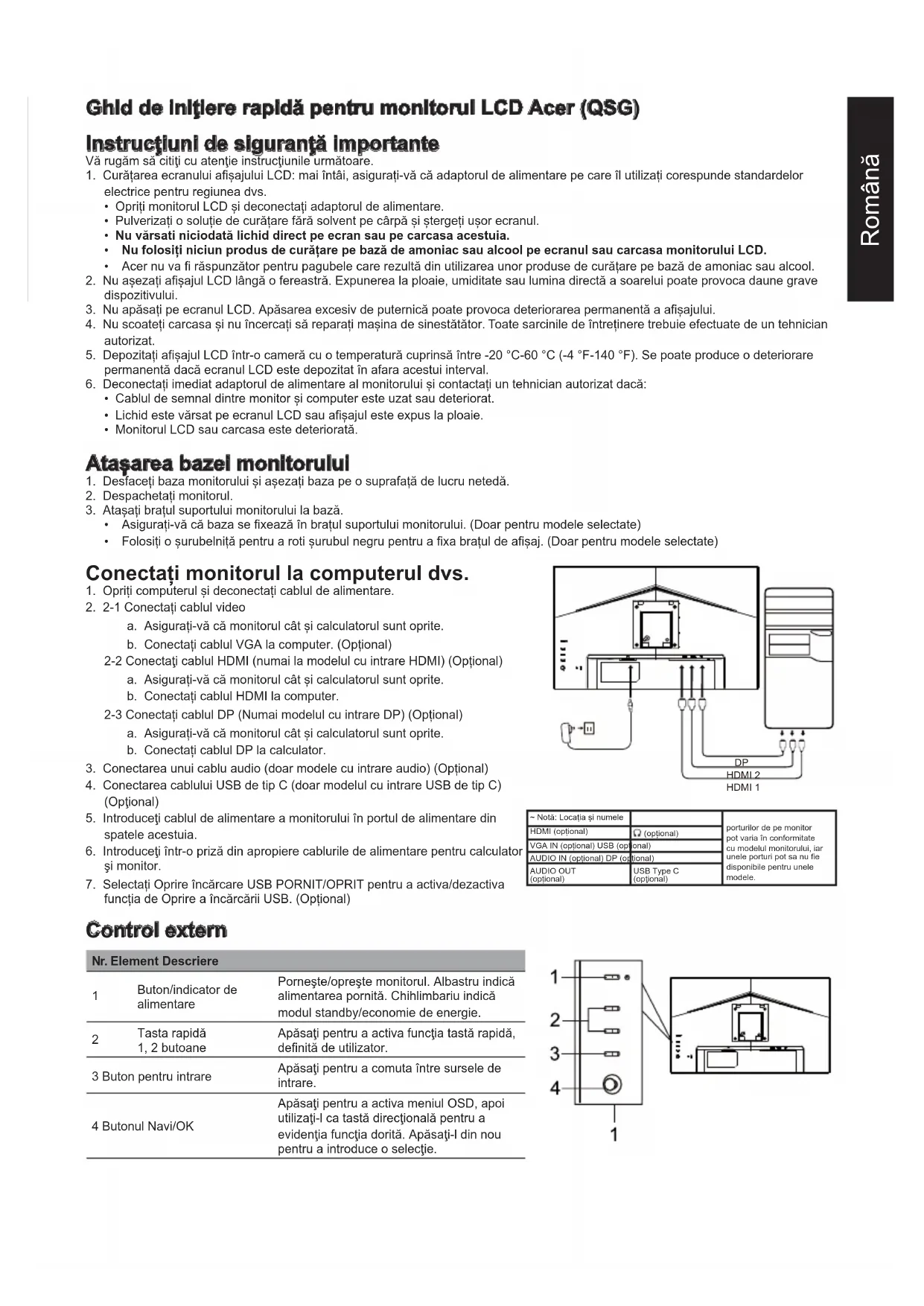 Tasta rapidă 1, 2 butoane Apăsaţi pentru a activa funcţia tastă rapidă, definită de utilizator. 3 Buton pentru intrare Apăsaţi pentru a comuta între sursele de intrare. 4 Butonul Navi/OK Apăsaţi pentru a activa meniul OSD, apoi utilizaţi-l ca tastă direcţională pentru a evidenţia funcţia dorită. Apăsaţi-l din nou pentru a introduce o selecţie. HDMI 2 HDMI 1 DPRomână Declarații de reglementare și siguranță Declarație FCC Acest echipament a fost testat și s-a dovedit că respectă limitele pentru un dispozitiv digital din clasa B, în conformitate cu partea 15 din Regulile FCC. Aceste limite sunt concepute pentru a oferi o protecție rezonabilă împotriva interferențelor dăunătoare atunci când echipamentul este instalat într-o zonă rezidențială. Acest echipament generează, utilizează și poate radia energie de frecvență radio și, dacă nu este instalat și utilizat în conformitate cu instrucțiunile, poate provoca interferențe la comunicațiile radio. Cu toate acestea, nu există nicio garanție că interferența nu va apărea într-o anumită instalație. Dacă dispozitivul provoacă interferențe la recepția radio sau TV (care poate fi determinată de aparatul de comandă), utilizatorului i se recomandă să ia una sau mai multe dintre următoarele măsuri pentru a elimina interferența: