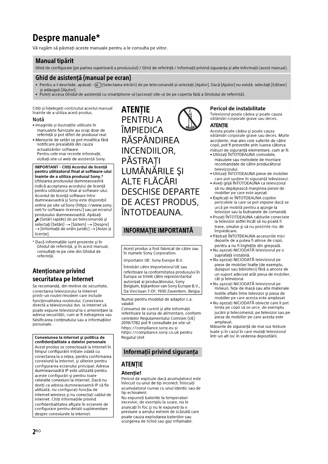 DESCHISE DEPARTE DE ACEST PRODUS, ÎNTOTDEAUNA. Numai pentru modelul de adaptor c.a. valabil:Consumul de curent şi alte informaţii referitoare la sursa de alimentare, conform cerinţelor Regulamentului Comisiei (UE) 2019/1782 pot fi consultate pe site-ul:https://compliance.sony.eu șihttps://compliance.sony.co.uk pentru Regatul Unit ATENŢIE Atenţie! Pericol de explozie dacă acumulatorul este înlocuit cu unul de tip incorect. Înlocuiți acumulatorul numai cu unul identic sau de tip echivalent.Nu expuneţi bateriile la temperaturi excesive, de exemplu la soare, nu le aruncaţi în foc şi nu le expuneţi la o presiune a aerului extrem de scăzută care poate cauza explodarea bateriilor sau scurgerea de lichid sau gaz inflamabil. Pericol de instabilitate Televizorul poate cădea şi poate cauza vătămări corporale grave sau deces. ATENŢIE Acesta poate cădea şi poate cauza vătămări corporale grave sau deces. Multe accidente, mai ales cele suferite de către copii, pot fi prevenite prin luarea câtorva măsuri de siguranţă elementare, cum ar fi:• Utilizaţi ÎNTOTDEAUNA comodele, măsuţele sau metodele de montare recomandate de către producătorul televizorului.• Utilizaţi ÎNTOTDEAUNA piese de mobilier care pot susţine în siguranţă televizorul.• Aveţi grijă ÎNTOTDEAUNA ca televizorul să nu depăşească marginea piesei de mobilier pe care este aşezat.• Explicaţi-le ÎNTOTDEAUNA copiilor pericolele la care se pot expune dacă se urcă pe mobilă pentru a ajunge la televizor sau la butoanele de comandă.• Pozaţi ÎNTOTDEAUNA cablurile conectate la televizor astfel încât să nu poată fi trase, smulse şi să nu prezinte risc de împiedicare.• Păstrați ÎNTOTDEAUNA accesoriile mici departe de a putea fi atinse de copii, pentru a nu fi înghițite din greșeală.• Nu aşezaţi NICIODATĂ televizorul pe o suprafaţă instabilă.• Nu aşezaţi NICIODATĂ televizorul pe piese de mobilier înalte (de exemplu, dulapuri sau biblioteci) fără a ancora de un suport adecvat atât piesa de mobilier, cât şi televizorul.• Nu aşezaţi NICIODATĂ televizorul pe milieuri, feţe de masă sau alte materiale textile aflate între televizor şi piesa de mobilier pe care acesta este amplasat.• Nu aşezaţi NICIODATĂ obiecte care îi pot tenta pe copii să se urce, de exemplu jucării şi telecomenzi, pe televizor sau pe piesa de mobilier pe care acesta este amplasat.Măsurile de siguranţă de mai sus trebuie luate şi în cazul în care mutaţi televizorul într-un alt loc în vederea depozitării. Despre manuale* Vă rugăm să păstraţi aceste manuale pentru a le consulta pe viitor. Manual tipărit Ghid de configurare (pe partea superioară a produsului) / Ghid de referință / Informații privind siguranța și alte informații (acest manual). Ghid de asistenţă (manual pe ecran)