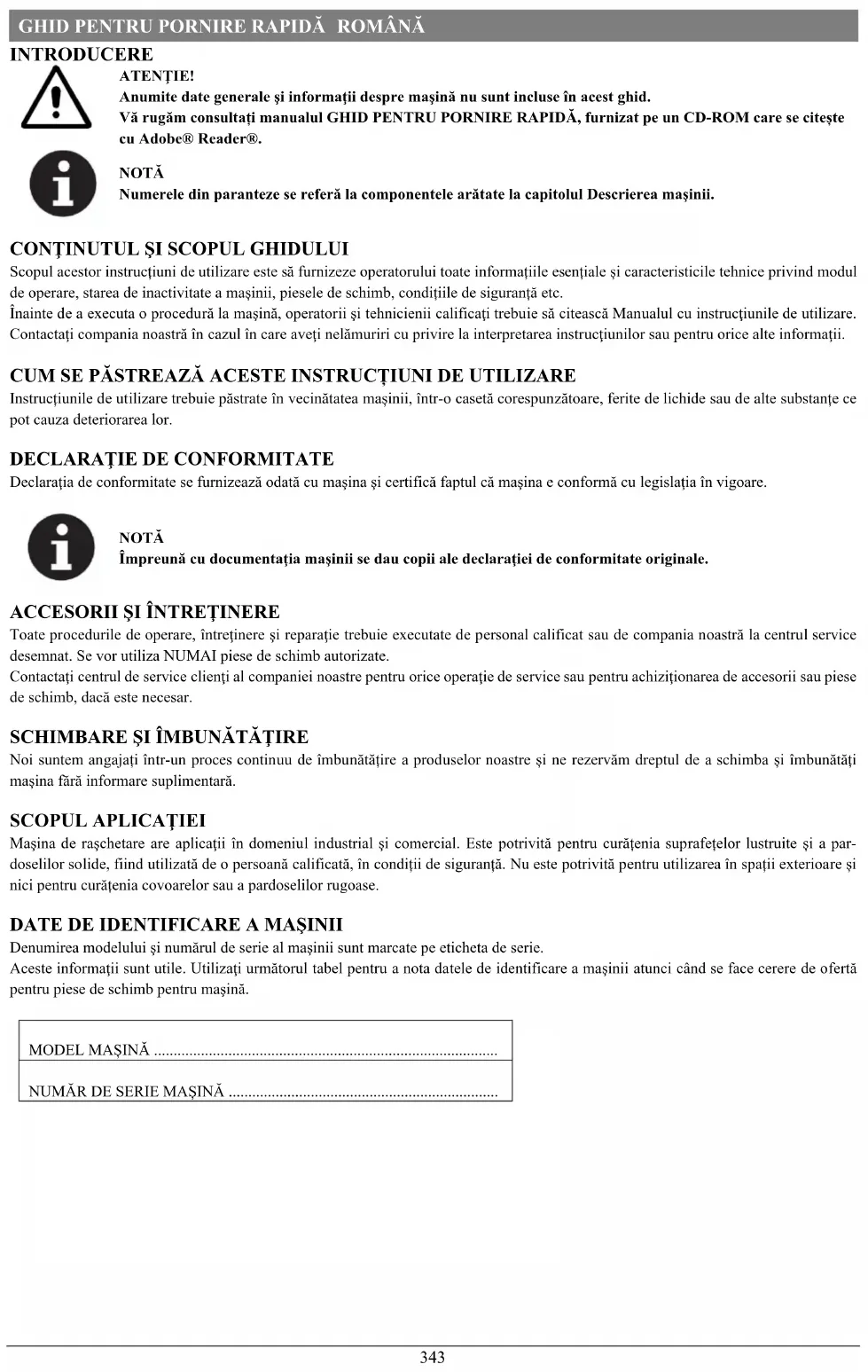 ATENŢIE! Anumite date generale şi informaţii despre maşină nu sunt incluse în acest ghid. Vă rugăm consultați manualul GHID PENTRU PORNIRE RAPIDĂ, furnizat pe un CD-ROM care se citește cu Adobe® Reader®.