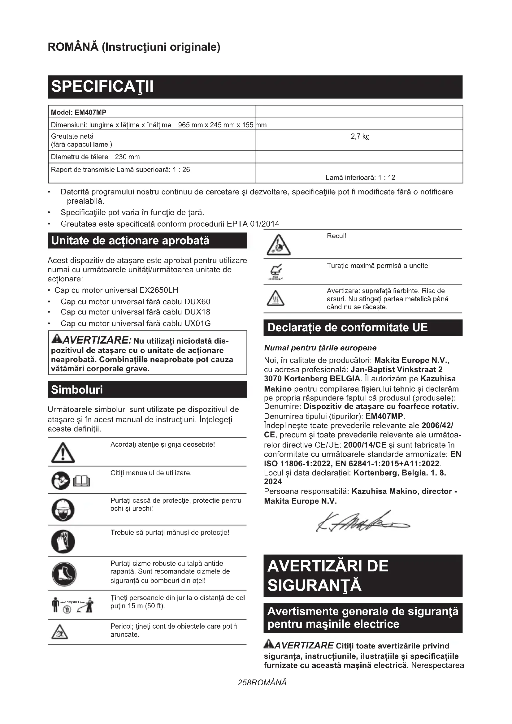 Ţineţipersoaneledinjurlaodistanţădecelpuţin15m(50ft).Pericol;ţineţicontdeobiectelecarepotaruncate.Recul!TuraţiemaximăpermisăaunelteiAvertizare:suprafațăerbinte.Riscdearsuri.Nuatingețiparteametalicăpânăcândnuserăcește. Declarație de conformitate UE Numai pentru ţările europene Noi,încalitatedeproducători:Makita Europe N.V., cuadresaprofesională:Jan-Baptist Vinkstraat 2 3070 Kortenberg BELGIA.ÎlautorizămpeKazuhisa Makinopentrucompilareașieruluitehnicșideclarăm pepropriarăspunderefaptulcăprodusul(produsele): Denumire: Dispozitiv de atașare cu foarfece rotativ. Denumirea tipului (tipurilor): EM407MP. Îndeplineştetoateprevederilerelevanteale2006/42/ CE,precumşitoateprevederilerelevantealeurmătoa- relor directive CE/UE: 2000/14/CEşisuntfabricateîn conformitatecuurmătoarelestandardearmonizate:EN ISO 11806-1:2022, EN 62841-1:2015+A11:2022. Loculșidatadeclarației:Kortenberg, Belgia. 1. 8.