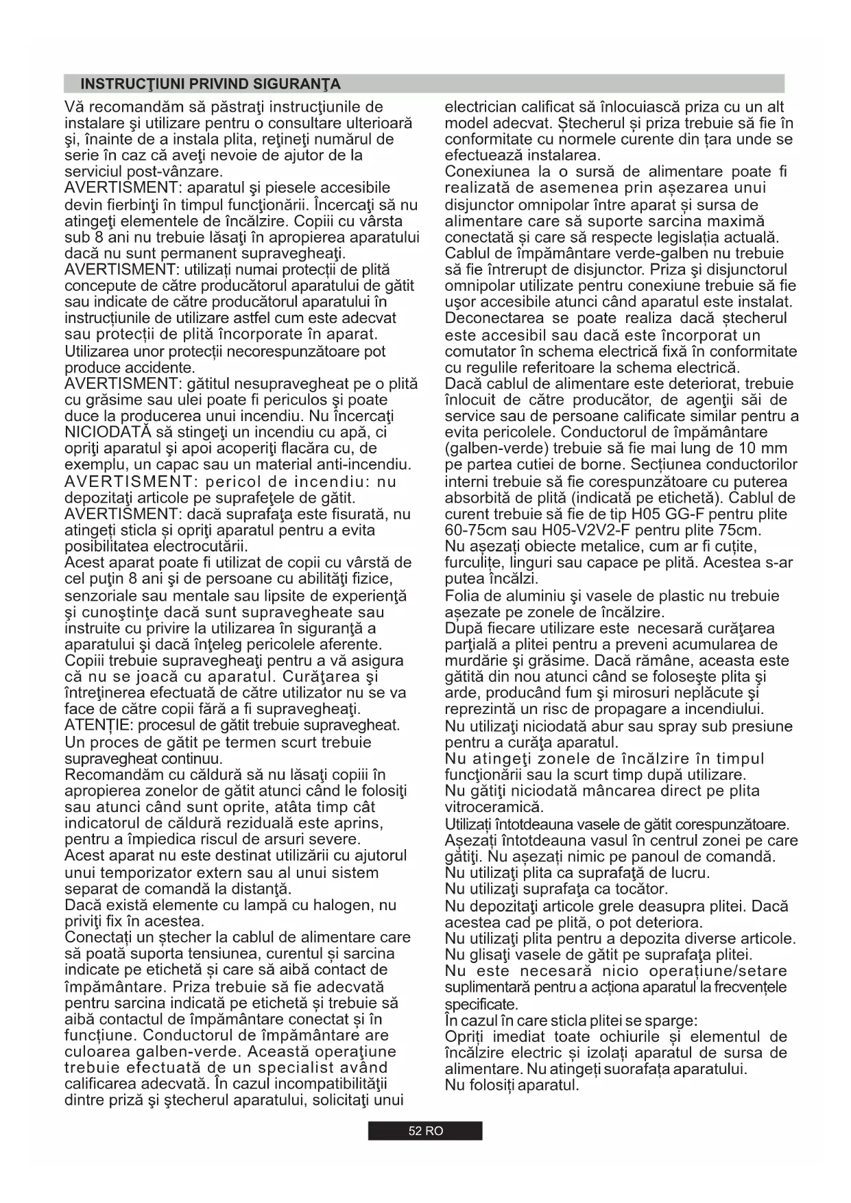 UR 3,5 kW52 RO Vă recomandăm să păstraţi instrucţiunile de instalare şi utilizare pentru o consultare ulterioară şi, înainte de a instala plita, reţineţi numărul de serie în caz că aveţi nevoie de ajutor de la serviciul post-vânzare. AVERTISMENT: aparatul şi piesele accesibile devin fierbinţi în timpul funcţionării. Încercaţi să nu atingeţi elementele de încălzire. Copiii cu vârsta sub 8 ani nu trebuie lăsaţi în apropierea aparatului dacă nu sunt permanent supravegheaţi. AVERTISMENT: utiliza¸i numai protec¸ii de plită concepute de către producătorul aparatului de gătit sau indicate de către producătorul aparatului în instruc¸iunile de utilizare astfel cum este adecvat sau protec¸ii de plită încorporate în aparat. Utilizarea unor protec¸ii necorespunzătoare pot produce accidente. AVERTISMENT: gătitul nesupravegheat pe o plită cu grăsime sau ulei poate fi periculos şi poate duce la producerea unui incendiu. Nu încercaţi NICIODATĂ să stingeţi un incendiu cu apă, ci opriţi aparatul şi apoi acoperiţi flacăra cu, de exemplu, un capac sau un material anti-incendiu. AVERTISMENT: pericol de incendiu: nu depozitaţi articole pe suprafeţele de gătit. AVERTISMENT: dacă suprafaţa este fisurată, nu atinge¸i sticla și opriţi aparatul pentru a evita posibilitatea electrocutării. Acest aparat poate fi utilizat de copii cu vârstă de cel puţin 8 ani şi de persoane cu abilităţi fizice, senzoriale sau mentale sau lipsite de experienţă şi cunoştinţe dacă sunt supravegheate sau instruite cu privire la utilizarea în siguranţă a aparatului şi dacă înţeleg pericolele aferente. Copiii trebuie supravegheaţi pentru a vă asigura că nu se joacă cu aparatul. Curăţarea şi întreţinerea efectuată de către utilizator nu se va face de către copii fără a fi supravegheaţi. ATEN¾IE: procesul de gătit trebuie supravegheat. Un proces de gătit pe termen scurt trebuie supravegheat continuu. Recomandăm cu căldură să nu lăsaţi copiii în apropierea zonelor de gătit atunci când le folosiţi sau atunci când sunt oprite, atâta timp cât indicatorul de căldură reziduală este aprins, pentru a împiedica riscul de arsuri severe. Acest aparat nu este destinat utilizării cu ajutorul unui temporizator extern sau al unui sistem separat de comandă la distanţă. Dacă există elemente cu lampă cu halogen, nu priviţi fix în acestea. Conecta¸i un ștecher la cablul de alimentare care să poată suporta tensiunea, curentul și sarcina indicate pe etichetă și care să aibă contact de împământare. Priza trebuie să fie adecvată pentru sarcina indicată pe etichetă și trebuie să aibă contactul de împământare conectat și în func¸iune. Conductorul de împământare are culoarea galben-verde. Această operaţiune trebuie efectuată de un specialist având calificarea adecvată. În cazul incompatibilităţii dintre priză şi ştecherul aparatului, solicitaţi unui