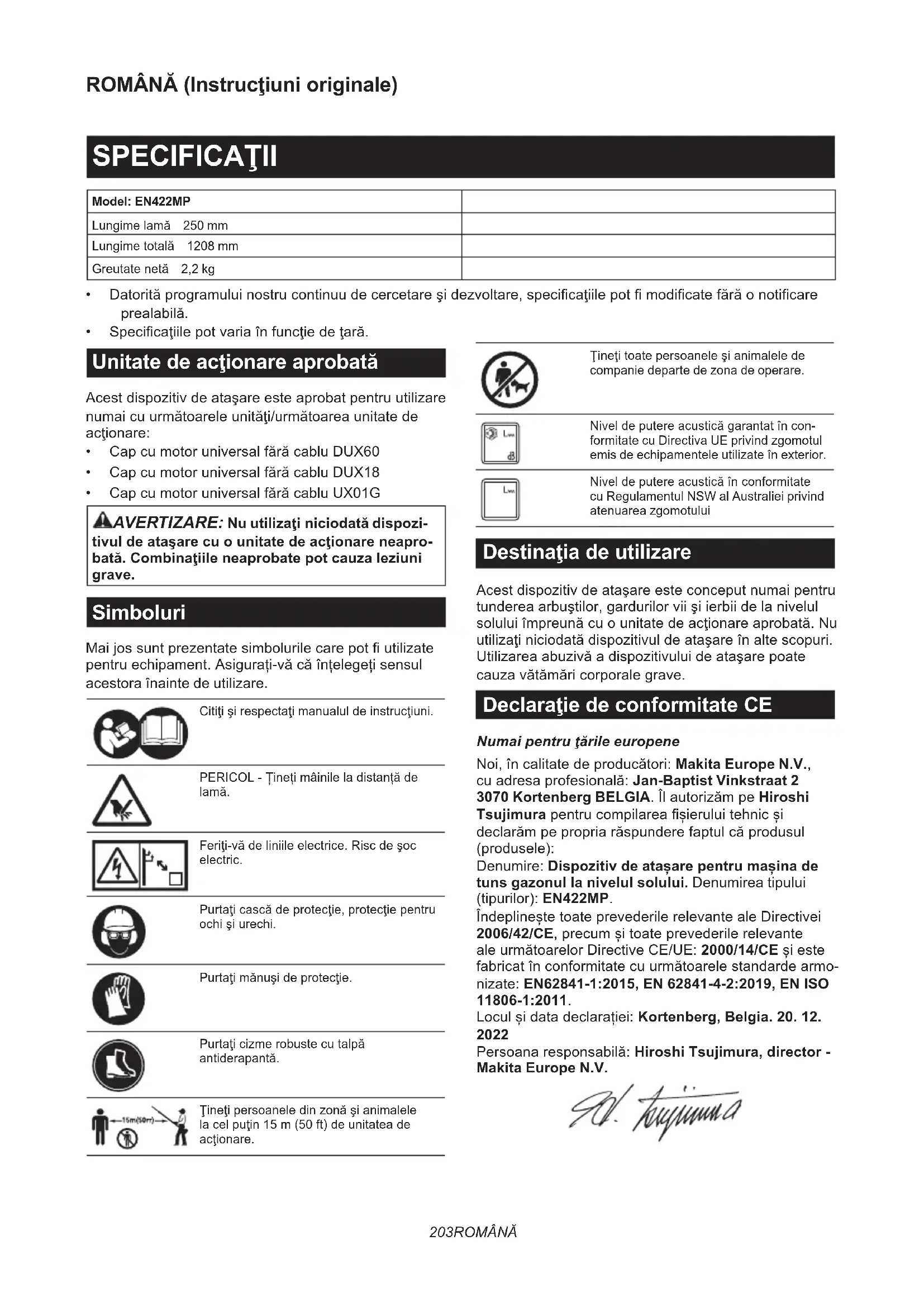 - CapcumotoruniversalfărăcabluUX01G AVERTIZARE: Nu utilizaţi niciodată dispozi- tivul de ataşare cu o unitate de acţionare neapro- bată. Combinaţiile neaprobate pot cauza leziuni grave. Simboluri Maijossuntprezentatesimbolurilecarepotutilizate pentruechipament.Asigurați-văcăînțelegețisensul acestora înainte de utilizare. Citiţişirespectaţimanualuldeinstrucţiuni. PERICOL-Ținețimâinileladistanțăde lamă. Feriţi-vădeliniileelectrice.Riscdeşoc electric. Purtaţicascădeprotecţie,protecţiepentru ochişiurechi. Purtaţimănuşideprotecţie. Purtaţicizmerobustecutalpă antiderapantă. Ţineţipersoaneledinzonăşianimalele lacelpuţin15m(50ft)deunitateade acţionare. Ţineţitoatepersoaneleşianimalelede companie departe de zona de operare. Niveldeputereacusticăgarantatîncon- formitate cu Directiva UE privind zgomotul emis de echipamentele utilizate în exterior. Niveldeputereacusticăînconformitate cu Regulamentul NSW al Australiei privind atenuarea zgomotului Destinaţia de utilizare Acestdispozitivdeataşareesteconceputnumaipentru tundereaarbuştilor,gardurilorviişiierbiidelanivelul soluluiîmpreunăcuounitatedeacţionareaprobată.Nu utilizaţiniciodatădispozitivuldeataşareînaltescopuri. Utilizareaabuzivăadispozitivuluideataşarepoate cauzavătămăricorporalegrave. Declaraţie de conformitate CE Numai pentru ţările europene Noi,încalitatedeproducători:Makita Europe N.V., cuadresaprofesională:Jan-Baptist Vinkstraat 2 3070 Kortenberg BELGIA.ÎlautorizămpeHiroshi Tsujimurapentrucompilareașieruluitehnicși declarămpepropriarăspunderefaptulcăprodusul (produsele): Denumire: Dispozitiv de atașare pentru mașina de tuns gazonul la nivelul solului. Denumirea tipului (tipurilor): EN422MP. ÎndeplineștetoateprevederilerelevantealeDirectivei 2006/42/CE,precumșitoateprevederilerelevante aleurmătoarelorDirectiveCE/UE:2000/14/CEșieste fabricatînconformitatecuurmătoarelestandardearmo- nizate: EN62841-1:2015, EN 62841-4-2:2019, EN ISO 11806-1:2011. Loculșidatadeclarației:Kortenberg, Belgia. 20. 12.