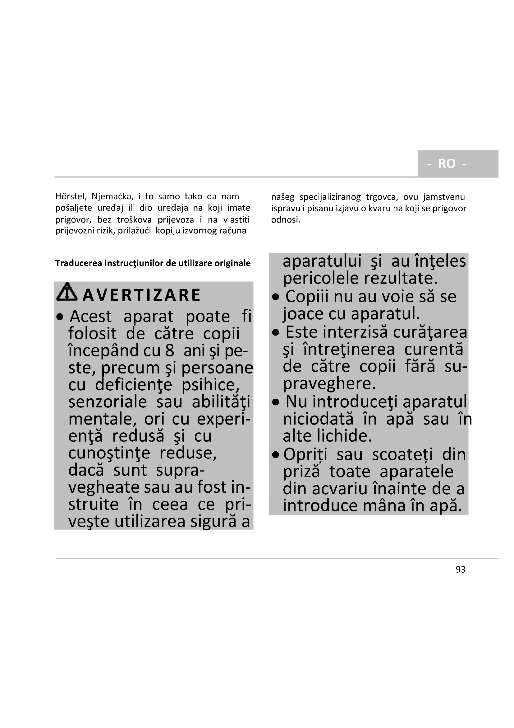 - Opriți sau scoateți din priză toate aparatele din acvariu înainte de a introduce mâna în apă.- RO -