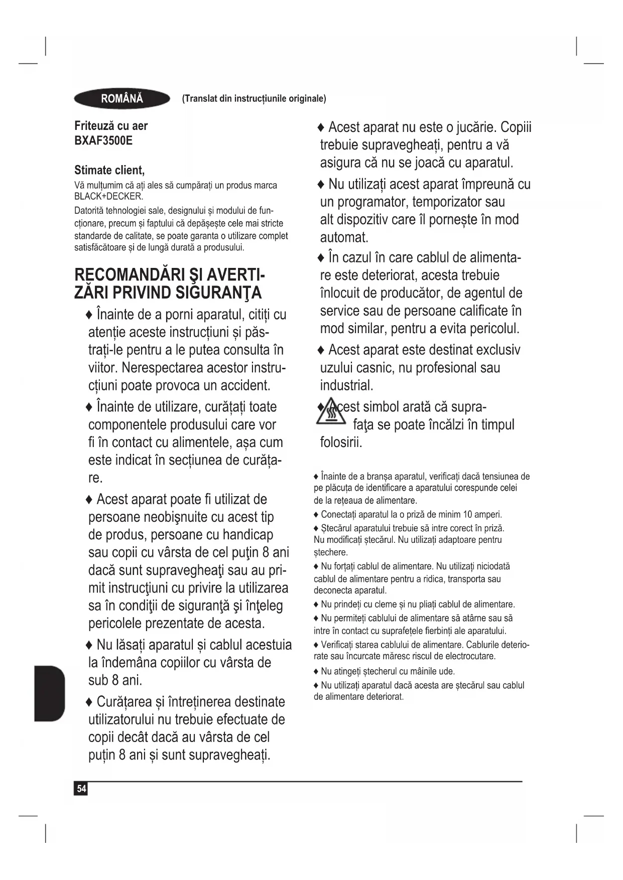 Friteuză cu aer BXAF3500E Stimate client, Vă mulțumim că ați ales să cumpărați un produs marca BLACK+DECKER. Datorită tehnologiei sale, designului și modului de fun- cționare, precum și faptului că depășește cele mai stricte standarde de calitate, se poate garanta o utilizare complet satisfăcătoare și de lungă durată a produsului.