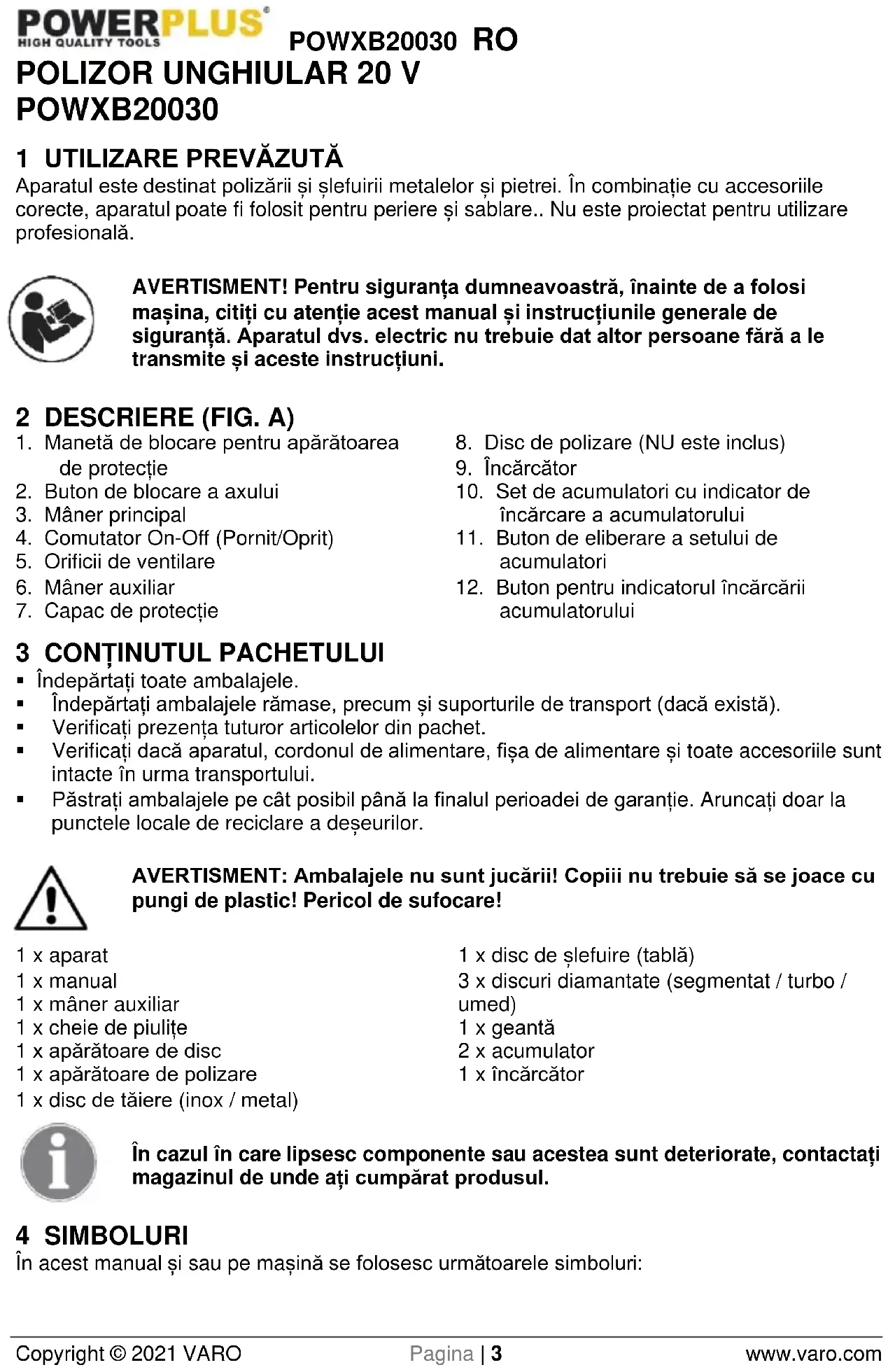 - Păstrați ambalajele pe cât posibil până la finalul perioadei de garanție. Aruncați doar la punctele locale de reciclare a deșeurilor. AVERTISMENT: Ambalajele nu sunt jucării! Copiii nu trebuie să se joace cu pungi de plastic! Pericol de sufocare! 1 x aparat 1 x manual 1 x mâner auxiliar 1 x cheie de piulițe 1 x apărătoare de disc 1 x apărătoare de polizare 1 x disc de tăiere (inox / metal) 1 x disc de șlefuire (tablă) 3 x discuri diamantate (segmentat / turbo / umed) 1 x geantă 2 x acumulator 1 x încărcător În cazul în care lipsesc componente sau acestea sunt deteriorate, contactați magazinul de unde ați cumpărat produsul. 4 SIMBOLURI În acest manual și sau pe mașină se folosesc următoarele simboluri:POWXB20030 RO Copyright © 2021 VARO Pagina | 4 www.varo.com