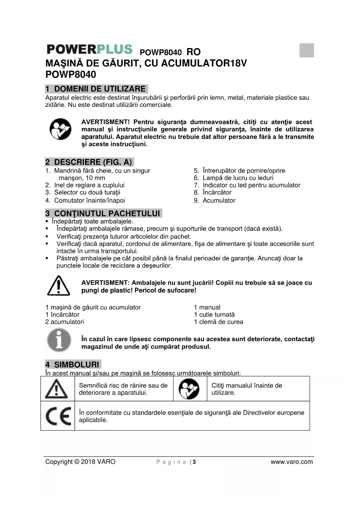 În conformitate cu standardele esenţiale de siguranţă ale Directivelor europene aplicabile.POWP8040 RO Copyright © 2018 VARO P a g i n a | 4 www.varo.com