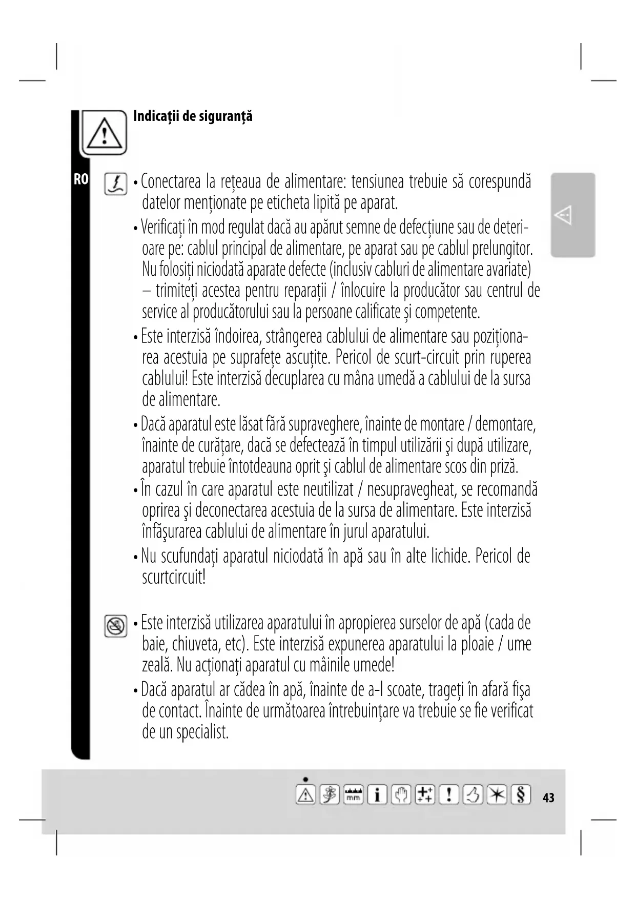 - Nu scufundaţi aparatul niciodată în apă sau în alte lichide. Pericol de scurtcircuit!