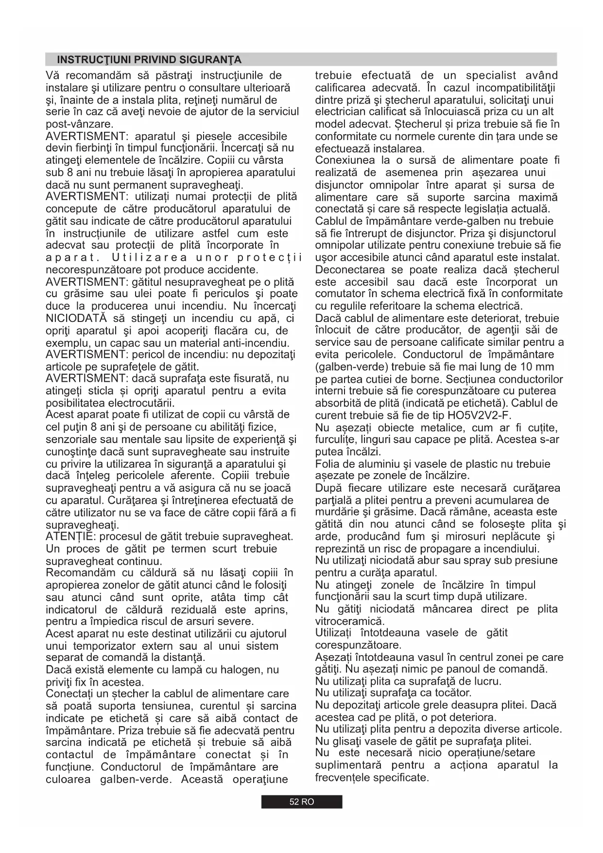 INSTALAREA UNUI APARAT ELECTROCASNIC REPREZINTĂ O OPERAŢIUNE COMPLICATĂ CARE, DACĂ NU ESTE CORECT REALIZATĂ, POATE AVEA CONSECINŢE NEPLĂCUTE ASUPRA SIGURANŢEI UTILIZATORULUI. DE ACEEA, INSTALAREA TREBUIE REALIZATĂ NUMAI DE CĂTRE O PERSOANĂ CALIFICATĂ ÎN ACEST SENS, CARE SĂ RESPECTE REGLEMENTĂRILE ÎN VIGOARE PRIVIND INSTALAREA. ÎN CAZUL ÎN CARE INSTALAREA NU ESTE REALIZATĂ DE CĂTRE O PERSOANĂ CALIFICATĂ, PRODUCĂTORUL NU ÎŞI ASUMĂ NICIO RESPONSABILITATE PENTRU EVENTUALELE PROBLEME SAU DEFECŢIUNI. Observaţie: Vă rugăm să verificaţi ca împământarea să fie realizată corect. În cazul în care apar defecţiuni ca urmare a unei împământări realizate incorect, producătorul îşi declină orice responsabilitate. 2.1. CONEXIUNEA ELECTRICĂ Înainte de a realiza conectarea, verificaţi împământarea. În conformitate cu legea, aparatul trebuie conectat la o priză prevăzută cu împământare. În cazul în care această recomandare nu este respectată, producătorul îşi declină orice responsabilitate pentru eventualele pagube sau avarii care se produc. În situaţia în care cablul de alimentare nu este prevăzut cu un ştecher, respectaţi diagrama de conectare a firelor. Cablul pentru împământare este colorat în verde şi galben. Ştecherul trebuie să fie întotdeauna accesibil. În cazul în care plita este conectată direct la sursa de alimentare, trebuie montat un întrerupător de circuit. Dacă este deteriorat cablul de alimentare, acesta trebuie înlocuit de către un electrician autorizat, astfel încât să se evite orice risc. Firul pentru împământare (colorat în verde şi galben) trebuie să fie cu 10 mm mai lung decât firele pentru fază şi nul. Secţiunea cablului utilizat trebuie să fie corespunzătoare cu puterea absorbită a plitei. Vă rugăm să verificaţi plăcuţa cu date tehnice pentru mai multe detalii şi cablul de alimentare trebuie să fie unul din următoarele tipuri 3x0.75 mm² H05 V2V2-F. Verificaţi informaţiile de pe plăcuţa cu date tehnice, situată pe exteriorul aparatului, pentru a vă asigura că sursa de alimentare la care va fi conectată plita este corespunzătoare.