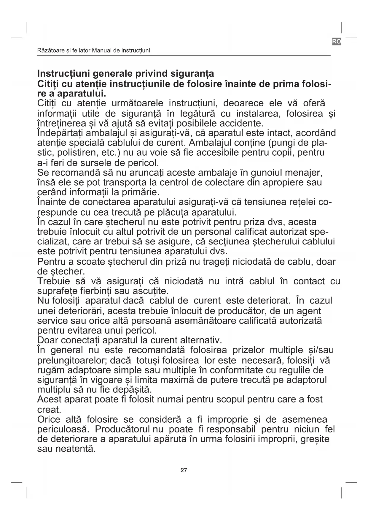 Instrucțiuni generale privind siguranța Citiți cu atenție instrucțiunile de folosire înainte de prima folosi- re a aparatului. Citiți cu atenție următoarele instrucțiuni, deoarece ele vă oferă informații utile de siguranță în legătură cu instalarea, folosirea și întreținerea și vă ajută să evitați posibilele accidente. Îndepărtați ambalajul și asigurați-vă, că aparatul este intact, acordând atenție specială cablului de curent. Ambalajul conține (pungi de pla- stic, polistiren, etc.) nu au voie să e accesibile pentru copii, pentru a-i feri de sursele de pericol. Se recomandă să nu aruncați aceste ambalaje în gunoiul menajer, însă ele se pot transporta la centrol de colectare din apropiere sau cerând informații la primărie. Înainte de conectarea aparatului asigurați-vă că tensiunea rețelei co- respunde cu cea trecută pe plăcuța aparatului. În cazul în care ștecherul nu este potrivit pentru priza dvs, acesta trebuie înlocuit cu altul potrivit de un personal calicat autorizat spe- cializat, care ar trebui să se asigure, că secțiunea ștecherului cablului este potrivit pentru tensiunea aparatului dvs. Pentru a scoate ștecherul din priză nu trageți niciodată de cablu, doar de ștecher. Trebuie să vă asigurați că niciodată nu intră cablul în contact cu suprafețe erbinți sau ascuțite. Nu folosiți aparatul dacă cablul de curent este deteriorat. În cazul unei deteriorări, acesta trebuie înlocuit de producător, de un agent service sau orice altă persoană asemănătoare calicată autorizată pentru evitarea unui pericol. Doar conectați aparatul la curent alternativ. În general nu este recomandată folosirea prizelor multiple și/sau prelungitoarelor; dacă totuși folosirea lor este necesară, folosiți vă rugăm adaptoare simple sau multiple în conformitate cu regulile de siguranță în vigoare și limita maximă de putere trecută pe adaptorul multiplu să nu e depășită. Acest aparat poate folosit numai pentru scopul pentru care a fost creat. Orice altă folosire se consideră a improprie și de asemenea periculoasă. Producătorul nu poate responsabil pentru niciun fel de deteriorare a aparatului apărută în urma folosirii improprii, greșite sau neatentă.Răzătoare și feliator Manual de instrucțiuni