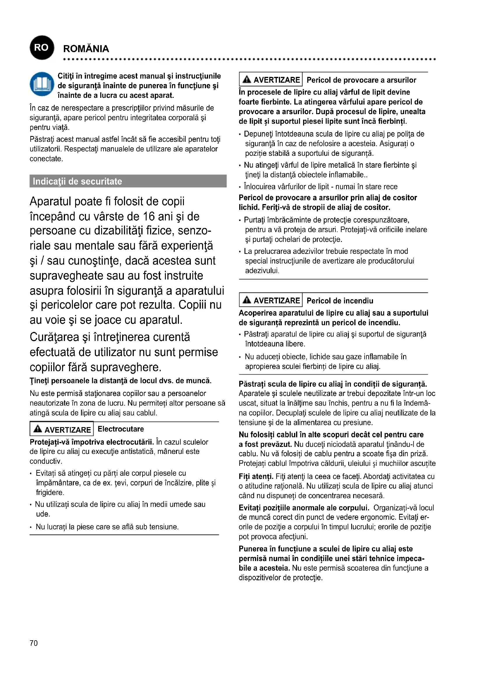 БЪЛГАРСКИ70 Citiţi în întregime acest manual şi instrucţiunile de siguranţă înainte de punerea în funcţiune şi înainte de a lucra cu acest aparat. În caz de nerespectare a prescripţiilor privind măsurile de siguranţă, apare pericol pentru integritatea corporală şi pentru viaţă. Păstraţi acest manual astfel încât să e accesibil pentru toţi utilizatorii. Respectaţi manualele de utilizare ale aparatelor conectate. Indicaţii de securitate Aparatul poate folosit de copii începând cu vârste de 16 ani şi de persoane cu dizabilităţi zice, senzo- riale sau mentale sau fără experienţă şi / sau cunoştinţe, dacă acestea sunt supravegheate sau au fost instruite asupra folosirii în siguranţă a aparatului şi pericolelor care pot rezulta. Copiii nu au voie şi se joace cu aparatul. Curăţarea şi întreţinerea curentă efectuată de utilizator nu sunt permise copiilor fără supraveghere. Ţineţi persoanele la distanţă de locul dvs. de muncă. Nu este permisă staţionarea copiilor sau a persoanelor neautorizate în zona de lucru. Nu permiteți altor persoane să atingă scula de lipire cu aliaj sau cablul. AVERTIZARE Electrocutare Protejați-vă împotriva electrocutării. În cazul sculelor de lipire cu aliaj cu execuţie antistatică, mânerul este conductiv.