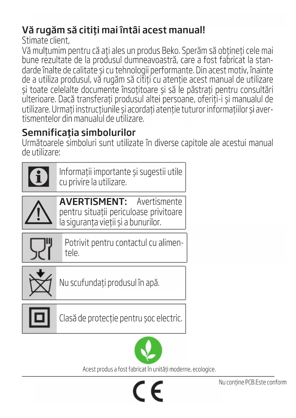 AVERTISMENT: Avertismente pentru situaţii periculoase privitoare la siguranţa vieţii și a bunurilor. Potrivit pentru contactul cu alimen- tele. Nu scufundați produsul în apă. Clasă de protecție pentru șoc electric. Acest produs a fost fabricat în unități moderne, ecologice. Nu conține PCB.Este conform cu Directiva DEEE.Valorile care sunt declarate pe etichetele aplicate pe aparatul dumneavoastră sau alte documente imprimate furnizate cu acesta reprezintă valorile care au fost obținute în laborator conform standardelor corespunzătoare. Aceste valori pot varia în funcție de utilizarea produsului și de condițiile ambientale.