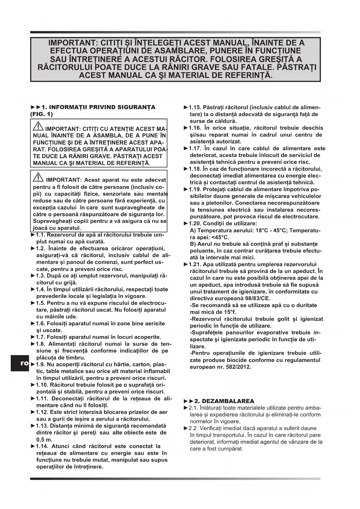 (FIG. 1) IMPORTANT: CITIȚI CU ATENȚIE ACEST MA- NUAL ÎNAINTE DE A ASAMBLA, DE A PUNE ÎN FUNCȚIUNE ŞI DE A ÎNTREŢINERE ACEST APA- RAT. FOLOSIREA GREȘITĂ A APARATULUI POA- TE DUCE LA RĂNIRI GRAVE. PĂSTRAȚI ACEST MANUAL CA ŞI MATERIAL DE REFERINȚĂ. IMPORTANT: Acest aparat nu este adecvat pentru a folosit de către persoane (inclusiv co- pii) cu capacități zice, senzoriale sau mentale reduse sau de către persoane fără experiență, cu excepția cazului în care sunt supravegheate de către o persoană răspunzătoare de siguranța lor. Supravegheați copiii pentru a vă asigura că nu se joacă cu aparatul. ►1.1. Rezervorul de apă al răcitorului trebuie um- plut numai cu apă curată. ►1.2. Înainte de efectuarea oricăror operațiuni, asigurați-vă că răcitorul, inclusiv cablul de ali- mentare și panoul de comenzi, sunt perfect us- cate, pentru a preveni orice risc. ►1.3. După ce ați umplut rezervorul, manipulați ră- citorul cu grijă. ►1.4. În timpul utilizării răcitorului, respectați toate prevederile locale și legislația în vigoare. ►1.5. Pentru a nu vă expune riscului de electrocu- tare, păstrați răcitorul uscat. Nu folosiți aparatul cu mâinile ude. ►1.6. Folosiți aparatul numai în zone bine aerisite şi uscate. ►1.7. Folosiți aparatul numai în locuri acoperite. ►1.8. Alimentați răcitorul numai la surse de ten- siune şi frecvență conforme indicațiilor de pe plăcuța de timbru. ►1.9. Nu acoperiți răcitorul cu hârtie, carton, plas- tic, table metalice sau orice alt material inamabil în timpul utilizării, pentru a preveni orice riscuri. ►1.10. Răcitorul trebuie folosit pe o suprafață ori- zontală şi stabilă, pentru a preveni orice riscuri. ►1.11. Deconectați răcitorul de la rețeaua de ali- mentare când nu îl folosiți. ►1.12. Este strict interzisă blocarea prizelor de aer sau a gurii de ieșire a aerului a răcitorului. ►1.13. Distanța minimă de siguranţă recomandată dintre răcitor şi pereți sau alte obiecte este de 0,5 m. ►1.14. Atunci când răcitorul este conectat la rețeaua de alimentare cu energie sau este în funcțiune nu trebuie mutat, manipulat sau supus operațiilor de întreținere. ►1.15. Păstrați răcitorul (inclusiv cablul de alimen- tare) la o distanță adecvată de siguranţă față de surse de căldură. ►1.16. În orice situație, răcitorul trebuie deschis şi/sau reparat numai în cadrul unui centru de asistență autorizat. ►1.17. În cazul în care cablul de alimentare este deteriorat, acesta trebuie înlocuit de serviciul de asistență tehnică pentru a preveni orice risc. ►1.18. În caz de funcționare incorectă a răcitorului, deconectați imediat alimentarea cu energie elec- trică și contactați centrul de asistență tehnică. ►1.19. Protejați cablul de alimentare împotriva po- sibilelor daune generate de mișcarea vehiculelor sau a pietonilor. Conectarea necorespunzătoare la tensiunea electrică sau instalarea necores- punzătoare, pot provoca riscul de electrocutare. ►1.20. Condiții de utilizare: A) Temperatura aerului: 18°C - 45°C; Temperatu- ra apei: <45°C. B) Aerul nu trebuie să conțină praf și substanțe poluante, în caz contrar curățarea trebuie efectu- ată la intervale mai mici. ►1.21. Apa utilizată pentru umplerea rezervorului răcitorului trebuie să provină de la un apeduct. În cazul în care nu este posibilă obținerea apei de la un apeduct, apa introdusă trebuie să e supusă unui tratament de igienizare, în conformitate cu directiva europeană 98/83/CE. -Se recomandă să se utilizeze apă cu o duritate mai mică de 15°f. -Rezervorul răcitorului trebuie golit și igienizat periodic în funcție de utilizare. -Suprafețele panourilor evaporative trebuie in- spectate și igienizate periodic în funcție de uti- lizare. -Pentru operațiunile de igienizare trebuie utili- zate produse biocide conforme cu regulamentul european nr. 582/2012. ►►2. DEZAMBALAREA ►2.1. Înlăturați toate materialele utilizate pentru amba- larea și expedierea răcitorului și eliminați-le conform normelor în vigoare. ►2.2. Vericați imediat dacă aparatul a suferit daune în timpul transportului. În cazul în care răcitorul pare deteriorat, informați imediat agentul de vânzare de la care a fost cumpărat. IMPORTANT: CITIȚI ȘI ÎNȚELEGEȚI ACEST MANUAL, ÎNAINTE DE A EFECTUA OPERAȚIUNI DE ASAMBLARE, PUNERE ÎN FUNCȚIUNE SAU ÎNTREȚINERE A ACESTUI RĂCITOR. FOLOSIREA GREŞITĂ A RĂCITORULUI POATE DUCE LA RĂNIRI GRAVE SAU FATALE. PĂSTRAȚI ACEST MANUAL CA ŞI MATERIAL DE REFERINȚĂ.ro ►►3. DESCRIERE (FIG. 2) Răcitoarele evaporative răcesc aerul cu ajutorul proce- sului natural de evaporare a apei. La baza funcționării acestor răcitoare de aer se aă răcirea evaporativă care exploatează schimbul energetic dintre apă și aer. Răcitoarele sunt alcătuite dintr-un panou evaporativ, un ventilator și un sistem în cascadă de distribuire a apei. Ventilatorul aspiră aerul din exterior și îl trece prin panoul evaporativ care este alcătuit integral din celulo- ză și care este udat, în continuu, de un sistem dedicat care pompează apa. ►►4. FUNCȚIONARE AVERTISMENT: Citiți cu atenție paragraful „INFORMAȚII PRIVIND SIGURANȚA”, înainte de a porni răcitorul. AVERTISMENT: Folosiți numai apă curată pentru a preveni defectele. AVERTISMENT: Vericați împământarea rețelei electrice. Conectarea la rețeaua electrică trebuie făcută conform normelor în vigoare. Alimentați răcitorul numai la surse de tensiune şi frecvență conforme indicațiilor de pe plăcuța de timbru. În funcție de model, pe răcitor se aă o serie de racor- duri și de robineți (FIG. 3): ►ROBINET DE PARȚIALIZARE A APEI (prezent în funcție de model) (A FIG. 3): Se utilizează pentru a regla debitul de apă la panoul răcitorului. Când robinetul este complet deschis (rotație antiorară a butonulu