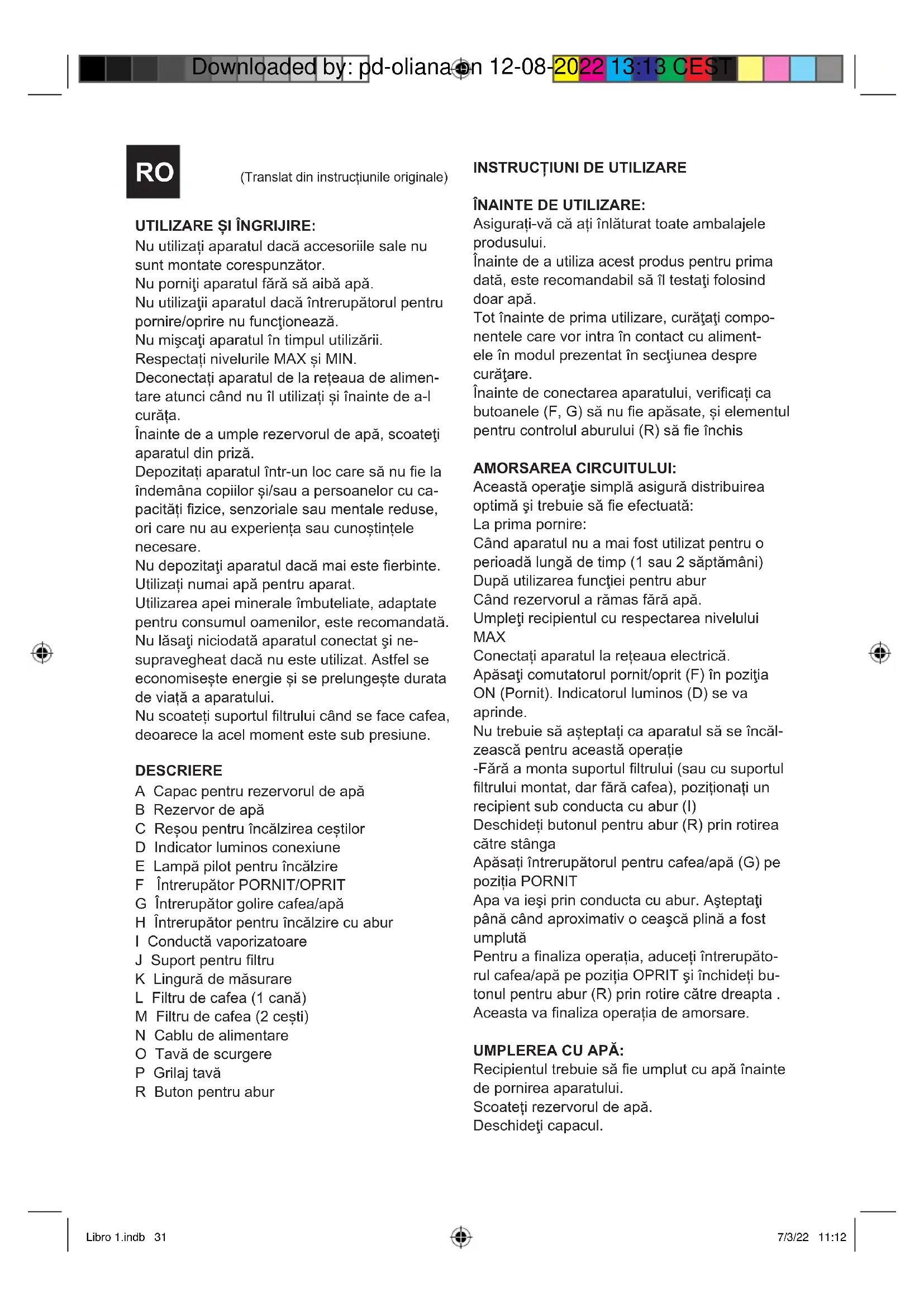 - Тръбата е задръстена. Почистете пароподаващата тръба с влажна кърпа, за да отстраните възможни засъхнали остатъци мляко, след което прокарайте отново отворите с помощта на игла. Натиснете съответния прекъсвач и испуснете пара, докато започне да излиза непрекъснато и със сила. Libro 1.indb 42 Libro 1.indb 42 7/3/22 11:12 7/3/22 11:12 Downloaded by: pd-oliana on 12-08-2022 13:13 CESTUTILIZARE ȘI ÎNGRIJIRE: Nu utilizați aparatul dacă accesoriile sale nu sunt montate corespunzător. Nu porniţi aparatul fără să aibă apă. Nu utilizaţii aparatul dacă întrerupătorul pentru pornire/oprire nu funcţionează. Nu mişcaţi aparatul în timpul utilizării. Respectați nivelurile MAX și MIN. Deconectați aparatul de la rețeaua de alimen- tare atunci când nu îl utilizați și înainte de a-l curăța. Înainte de a umple rezervorul de apă, scoateţi aparatul din priză. Depozitați aparatul într-un loc care să nu e la îndemâna copiilor și/sau a persoanelor cu ca- pacități zice, senzoriale sau mentale reduse, ori care nu au experiența sau cunoștințele necesare. Nu depozitaţi aparatul dacă mai este erbinte. Utilizați numai apă pentru aparat. Utilizarea apei minerale îmbuteliate, adaptate pentru consumul oamenilor, este recomandată. Nu lăsaţi niciodată aparatul conectat şi ne- supravegheat dacă nu este utilizat. Astfel se economisește energie și se prelungește durata de viață a aparatului. Nu scoateți suportul ltrului când se face cafea, deoarece la acel moment este sub presiune. DESCRIERE A Capac pentru rezervorul de apă B Rezervor de apă C Reșou pentru încălzirea ceștilor D Indicator luminos conexiune E Lampă pilot pentru încălzire F Întrerupător PORNIT/OPRIT G Întrerupător golire cafea/apă H Întrerupător pentru încălzire cu abur I Conductă vaporizatoare J Suport pentru ltru K Lingură de măsurare L Filtru de cafea (1 cană) M Filtru de cafea (2 cești) N Cablu de alimentare O Tavă de scurgere P Grilaj tavă R Buton pentru abur