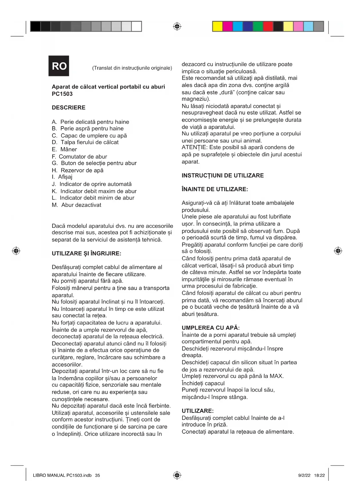 ÎNAINTE DE UTILIZARE: Asigurați-vă că ați înlăturat toate ambalajele produsului. Unele piese ale aparatului au fost lubriate ușor. În consecință, la prima utilizare a produsului este posibil să observați fum. După o perioadă scurtă de timp, fumul va dispărea. Pregătiți aparatul conform funcției pe care doriți să o folosiți. Când folosiţi pentru prima dată aparatul de călcat vertical, lăsaţi-l să producă aburi timp de câteva minute. Astfel se vor îndepărta toate impurităţile şi mirosurile rămase eventual în urma procesului de fabricaţie. Când folosiți aparatul de călcat cu aburi pentru prima dată, vă recomandăm să încercați aburul pe o bucată veche de țesătură înainte de a vă aburi țesătura. UMPLEREA CU APĂ: Înainte de a porni aparatul trebuie să umpleți compartimentul pentru apă. Deschideți rezervorul mișcându-l înspre dreapta. Deschideți capacul din silicon situat în partea de jos a rezervorului de apă. Umpleți rezervorul cu apă până la MAX. Închideți capacul Puneți rezervorul înapoi la locul său, mișcându-l înspre stânga. UTILIZARE: Desfășurați complet cablul înainte de a-l introduce în priză. Conectați aparatul la rețeaua de alimentare. RO (Translat din instrucțiunile originale) LIBRO MANUAL PC1503.indb 35LIBRO MANUAL PC1503.indb 35 9/2/22 18:229/2/22 18:22Apăsați pe butonul de selecție pentru abur și alegeți între pozițiile „Abur dezactivat”, „ECO” și „MAX”. Indicatorul va clipi până la atingerea temperaturii dorite, după care va rămâne aprins. Apăsați la timp butonul Abur pentru a începe să lucrați. NOTĂ: Nu este necesar să țineți butonul apăsat pentru a avea abur, o singură apăsare este sucientă; când nu mai doriți abur, apăsați din nou butonul pentru a termina operațiunea. Orientați aparatul pentru a direcționa uxul de abur în direcția dorită NOTĂ: Dacă nu schimbați modul la ecare 25 de secunde, produsul va elibera abur APARATUL DE CĂLCAT CU ABURI: Aparatul de călcat cu aburi este ușor de utilizat și este perfect pentru a îndepărta pliurile/cutele de pe haine și perdele, precum și pentru a reîmprospăta țesăturile pentru mobilier. Se poate utiliza pe majoritatea tipurilor de ţesături, cu condiţia ca acestea să e suspendate sau ca aparatul de călcat vertical portabil cu aburi să poată folosit în poziţie verticală, deplasându-l în sus şi în jos de-a lungul ţesăturii. NOTĂ: aparatul de călcat vertical portabil cu aburi este proiectat pentru utilizarea în poziţie verticală, pentru haine suspendate. Nu-l utilizaţi pentru articole de îmbrăcăminte aate în poziţie orizontală. Aşezaţi îmbrăcămintea pe un umeraş şi întindeţi-o uşor, cu mâna. Vericaţi ca în spatele ţesăturii să existe aer. Vericaţi ca buzunarele hainelor să e goale. NOTĂ: se recomandă să nu atingeţi accesoriile de metal. Fiţi atent şi călcaţi în jurul acestora. Călcarea perdelelor